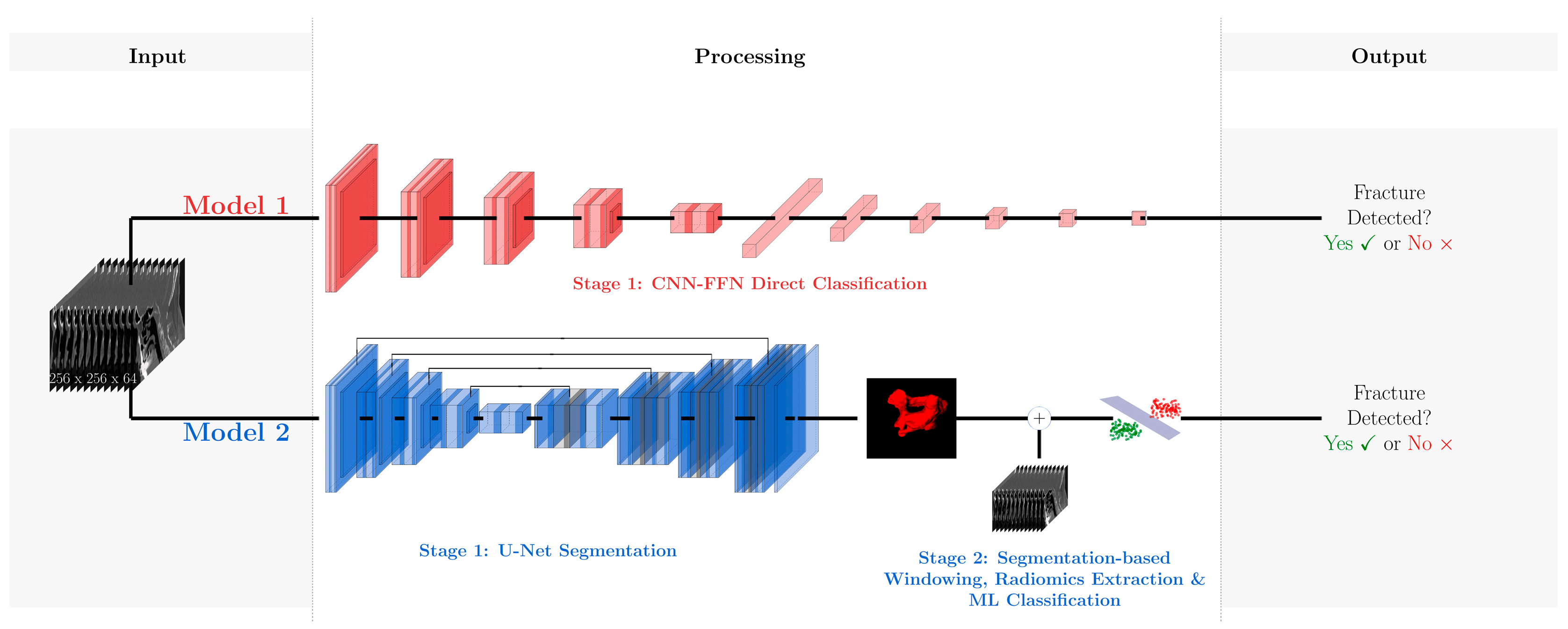 - Liu, J.; Zhang, L.; Yuan, Y.; Tang, J.; Liu, Y.; Xia, L.; Zhang, J. Deep Learning Radiomics Model Based on Computed Tomography Image for Predicting the Classification of Osteoporotic Vertebral Fractures: Algorithm Development and Validation. JMIR Med. Inform. 2025, 13, e75665. [Google Scholar] [CrossRef]