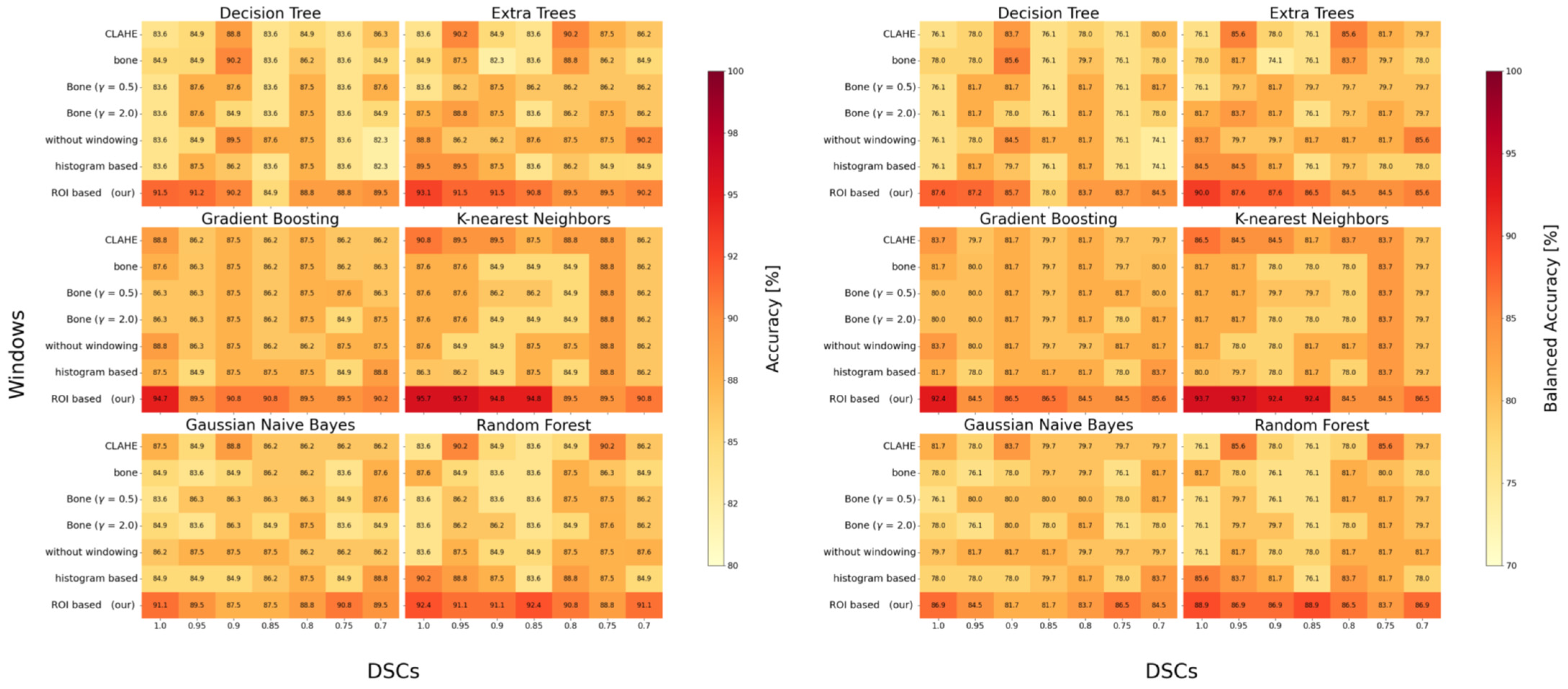 - ROI-Based Windowing: This targeted method utilizes the segmentation mask of the dens region to calculate the 5th and 95th percentile intensity values within the ROI and its immediate surroundings. These values are then applied uniformly to the entire image to maintain consistent contrast and prevent localized discrepancies. This approach ensures clinical readability and, in a two-stage pipeline such as Model M2, can be fully automated using upstream segmentation results.