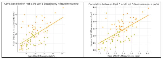 A strong intra-observer reproducibility was demonstrated when comparing the first five versus the last five elastography measurements expressed in kPa. The ICC was 0.99, and the Pearson correlation coefficient was r = 0.997 (p < 0.0001), confirming an excellent agreement between the two series. When comparing the first five versus the last five velocity-based elastography measurements expressed in m/s, the ICC was 0.61 and the Pearson correlation coefficient was r = 0.61 (p < 0.0001), indicating a moderate agreement and reproducibility between the two sets (Figure 1).