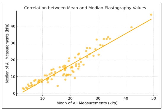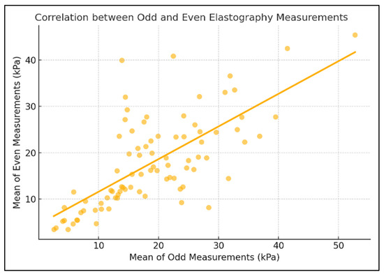 To further assess internal consistency, the elastography measurements were divided into odd- and even-numbered sequences. The agreement between these subsets was good, with an ICC of 0.702 and a Pearson correlation coefficient of r = 0.702 (p < 0.0001) (Figure 2). In addition, the overall mean and median values across all ten measurements per patient were highly consistent, showing an excellent agreement (ICC = 0.938, r = 0.938, p < 0.0001), supporting the robustness of the central tendency measures used in the analysis (Figure 3).