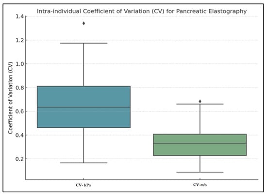 Intra-individual variability of pancreatic elastography measurements was assessed using the coefficient of variation (CV). The mean CV for values expressed in kilopascals was 0.640 (median 0.634, range: 0.166–1.342), while for values expressed in meters per second, the mean CV was 0.328 (median 0.331, range: 0.087–0.684), as presented in Figure 4. Agreement between the first five and last five pancreatic elastography measurements (in kPa) was further assessed using a Bland–Altman analysis. The mean difference was −0.06 kPa, with limits of agreement ranging from −5.63 to +5.52 kPa. The differences were symmetrically distributed around the mean, indicating a good level of reproducibility across repeated measurements. In the Bland–Altman analysis of the first five versus last five measurements expressed in meters per second, the mean difference was −0.01 m/s, with limits of agreement from −0.43 to +0.41 m/s (Figure 5 and Figure 6).