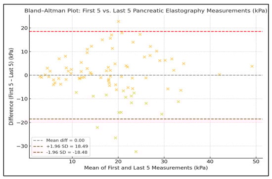 Bland–Altman Plots Showing Agreement Between the First and Last Five Pancreatic Elastography Measurements (kPa).