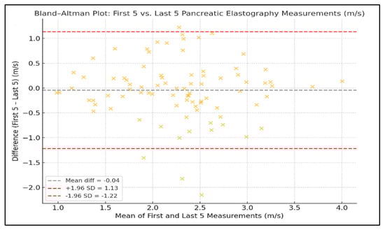 Bland–Altman Plots Showing Agreement Between the First and Last Five Pancreatic Elastography Measurements (m/s).