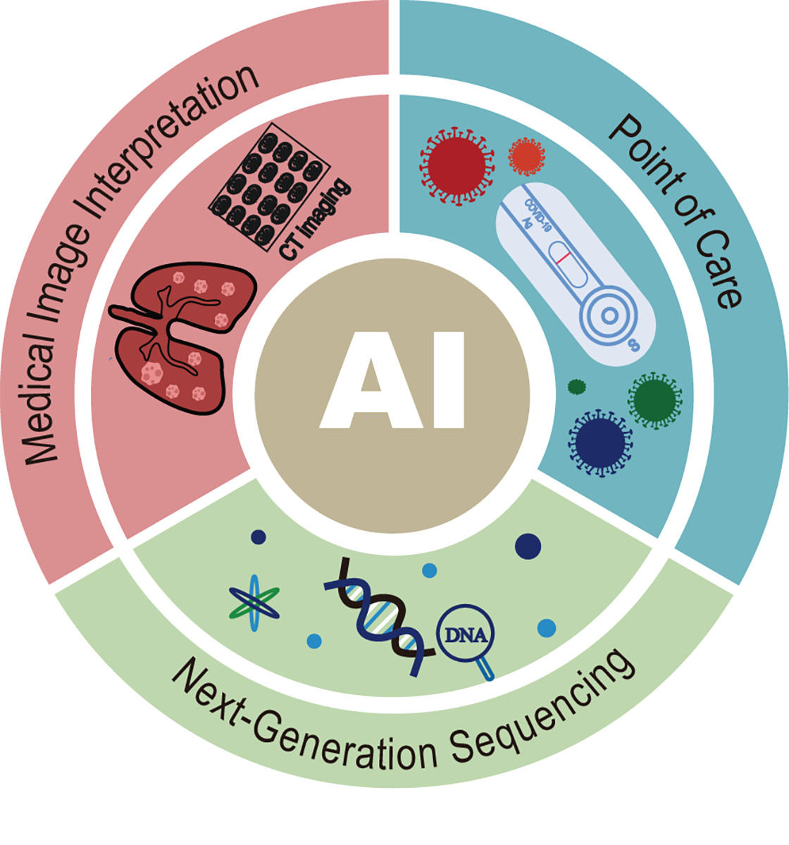 9]. These applications span critical areas: from the rapid identification of pathogens via genomic sequencing to the automated analysis of medical imaging; and from intelligent POCT systems to real-time epidemic surveillance networks [