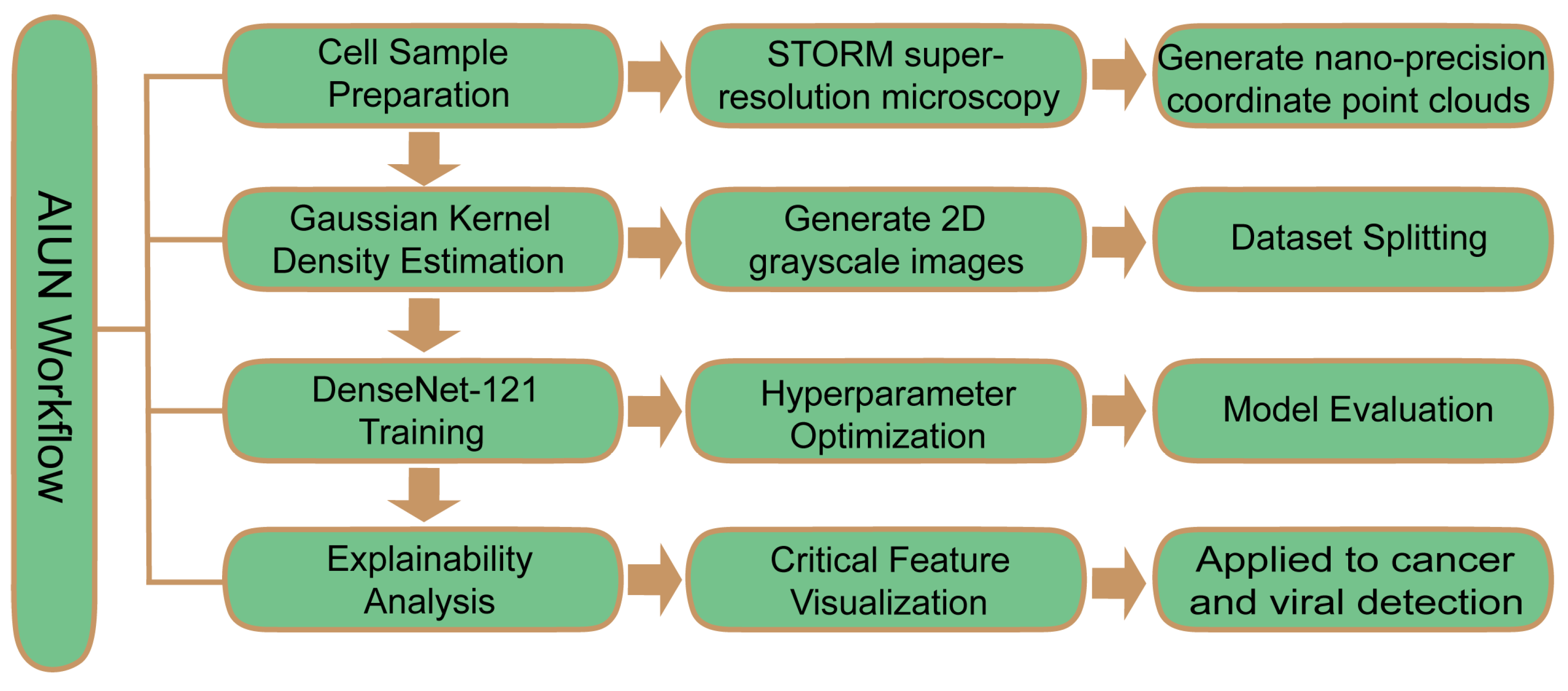 Figure 3). In contrast, AINU employs a fundamentally different paradigm by focusing on early-stage, subtle morphological alterations induced within host cell nuclei following viral infection. The core technology of AINU leverages advanced deep learning models to analyze high-dimensional nuclear image data acquired through super-resolution microscopy. This analysis enables the detection of infection-induced abnormalities in key nuclear components, such as alterations in histone modification patterns and spatial distribution and clustering status of RNA polymerase II. This approach demonstrates high sensitivity in identifying infected cells during the very early stages of active viral replication, prior to the emergence of significant cytopathic effects or robust immune responses. By integrating explainable artificial intelligence (XAI) techniques, AINU has identified key nuclear features that discriminate between healthy and infected cell states. This capability provides a novel analytical framework for understanding cellular heterogeneity and elucidating the mechanisms of viral infection [