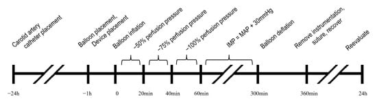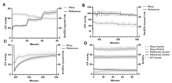 ACS was induced using the intracompartmental balloon model adapted from Honjol et al. [25]. On the day of ACS induction, the animals were placed in a supine position under general anesthesia. A 6.4 mm trocar was inserted in the right hind limb from the medial distal aspect of the anterior compartment towards the lateral proximal aspect, following the path of least resistance between the anterior tibial surface and the anterior muscle compartment. A sterile plastic surgical tubing was passed over the trocar, and the trocar was removed, leaving the surgical tubing in place. An 18 × 40 mm balloon angiocatheter (C.R. Bard Inc., Murray Hill, NJ, USA) was advanced through the surgical tubing and the surgical tube was removed with the balloon angiocatheter remaining in the limb. The contralateral control limb was not subjected to any procedure. The animals were placed in a right-side lateral recumbent position for the remainder of the ischemic injury procedure. Mikro-tip® catheter transducers (Millar, Houston, TX, USA) were inserted percutaneously while connected to a data acquisition system after calibration in accordance with the manufacturer’s instructions. The probes were guided through the lumen of a 16-gauge IV catheter (Terumo, Somerset, NJ, USA) at angles from 30° to 45° to the skin in a proximal direction and advanced to the mid belly of the peroneus tertius muscle in accordance with the manufacturer’s instructions. Two probes were inserted into each limb. The MY01® probe was placed only in the injured limb, using the same approach as the control probes. Reproducibility of pressure changes was checked with passive dorsiflexion of the ankle and probes were secured with non-circumferential adhesive tape. Moxy Monitors were placed on the skin, overlaying anterior compartments of injured and contralateral hind limbs, and secured with opaque tape. ICP values from Mikro-Tip® catheter transducers were averaged and used as an ICP reference for angiocatheter balloon inflation volumes, and differences between duplicate reference probes served as an indicator of variability. The carotid artery cannula was used to monitor and record hemodynamic parameters throughout the experiment (Supplementary Material S1: Picture: Experimental Set Up). Following the probe placement, the balloon was gradually inflated with saline to elevate ICP. The ICP was elevated to 50%, 75%, and 100% of the diastolic pressure (ΔP) over a period of 60 min at 20 min intervals (Figure 1). After one hour of stepwise ICP elevation (pre-ischemia phase), the balloon angiocatheter was further inflated until the ICP exceeded the mean arterial pressure (MAP) by >30 mmHg. This elevated pressure was maintained for four hours to produce prolonged ischemia.