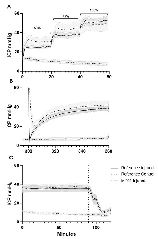 Intracompartmental limb pressure quantified by MY01® vs. reference probes. (A) Intracompartmental pressure graphs during stepwise balloon inflation (50%, 75%, and 100% of diastolic blood pressures, indicated by brackets); (B) reperfusion following balloon deflation; (C) 24 h post-injury pre- and post-fasciotomy (indicated by vertical dotted line). Intracompartmental pressures during ischemia exceeded the upper limit of detection of the MY01® device. Shaded regions indicate SEM of limb pressures (n = 8). ICP, intracompartmental pressure.