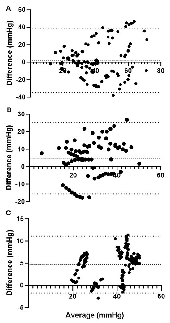 Bland−Altman plots of ICP quantified by reference probes vs. MY01®. Mean ICP vs. differences in ICP quantified by reference probes and MY01®; (A) During pre-ischemia, there was a mean bias of 2.21 ± 18.77 (95% CI: −34.58–39.00) mmHg compared to reference probes; (B) during reperfusion, there was a mean bias of 4.86 ± 10.43 (95% CI: −15.57–25.30) mmHg compared to reference probes; (C) 24 h post-injury there was a mean bias of 4.69 ± 3.28 (95% CI: −1.74–11.11) mmHg compared to reference probes.