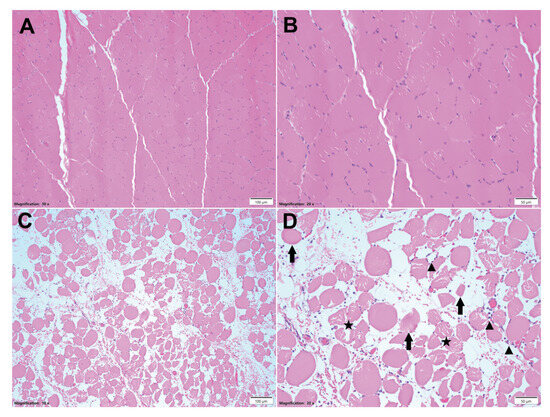 Histologic images of control and injured muscle. Representative H & E staining of full cross sections of peroneus tertius muscles. (A) Muscle example of control limb, 10× magnified, scale bar = 120 µm; (B) muscle example of control limb, 20× magnified, scale bar = 500 µm. Muscle of control limb showed no histologic abnormalities; (C) muscle example of injured limb, 10× magnified, scale bar = 100 µm; (D) muscle example of injured limb, 20× magnified, scale bar = 50 µm. Within the injured limbs, myocytes exhibit polyphasic degenerative and necrotic changes characterized by pale, swollen, and vacuolated sarcoplasm (star) with disrupted myofibrils (degeneration); hypereosinophilic, shrunken, and fragmented or hyalinized sarcoplasm (arrows) with loss of cross striations and a pyknotic or karyorrhectic nucleus (necrosis); or rarely have lightly basophilic sarcoplasm with multiple internalized, linearly arranged, vesiculate nuclei with prominent nucleoli (regeneration). Rarely, multifocal random foci of inflammatory cells (▲) expand the epimysium, perimysium, and endomysium, and surrounded and separate individual myocytes, composed primarily of neutrophils and eosinophils.