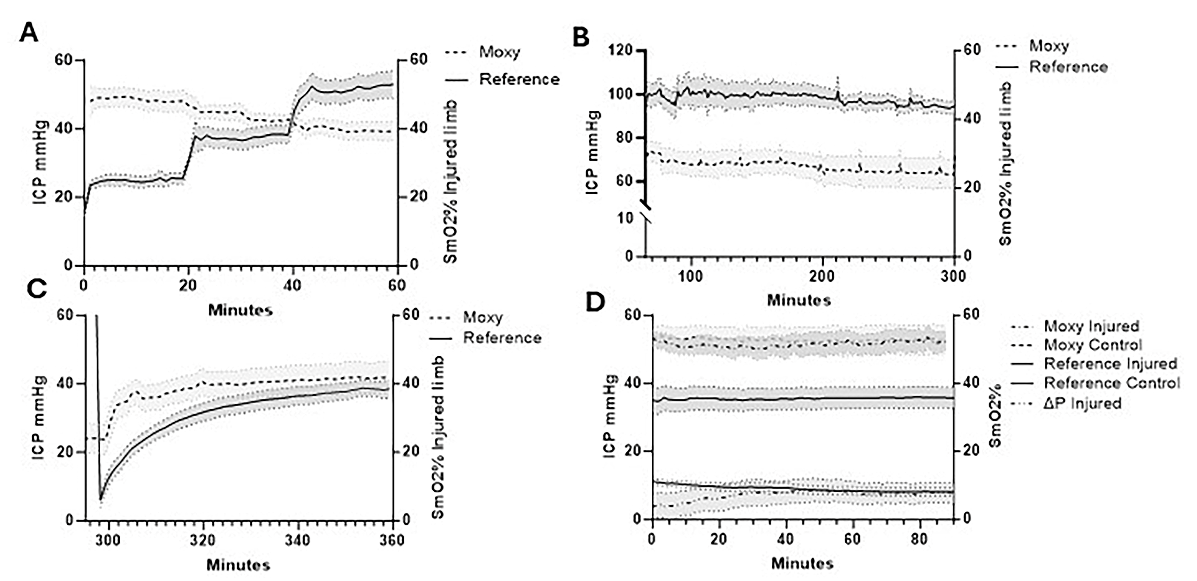 Commercially available devices measuring ICP or muscle oxygenation were utilized across each phase of injury for comparison against ICP reference probes (