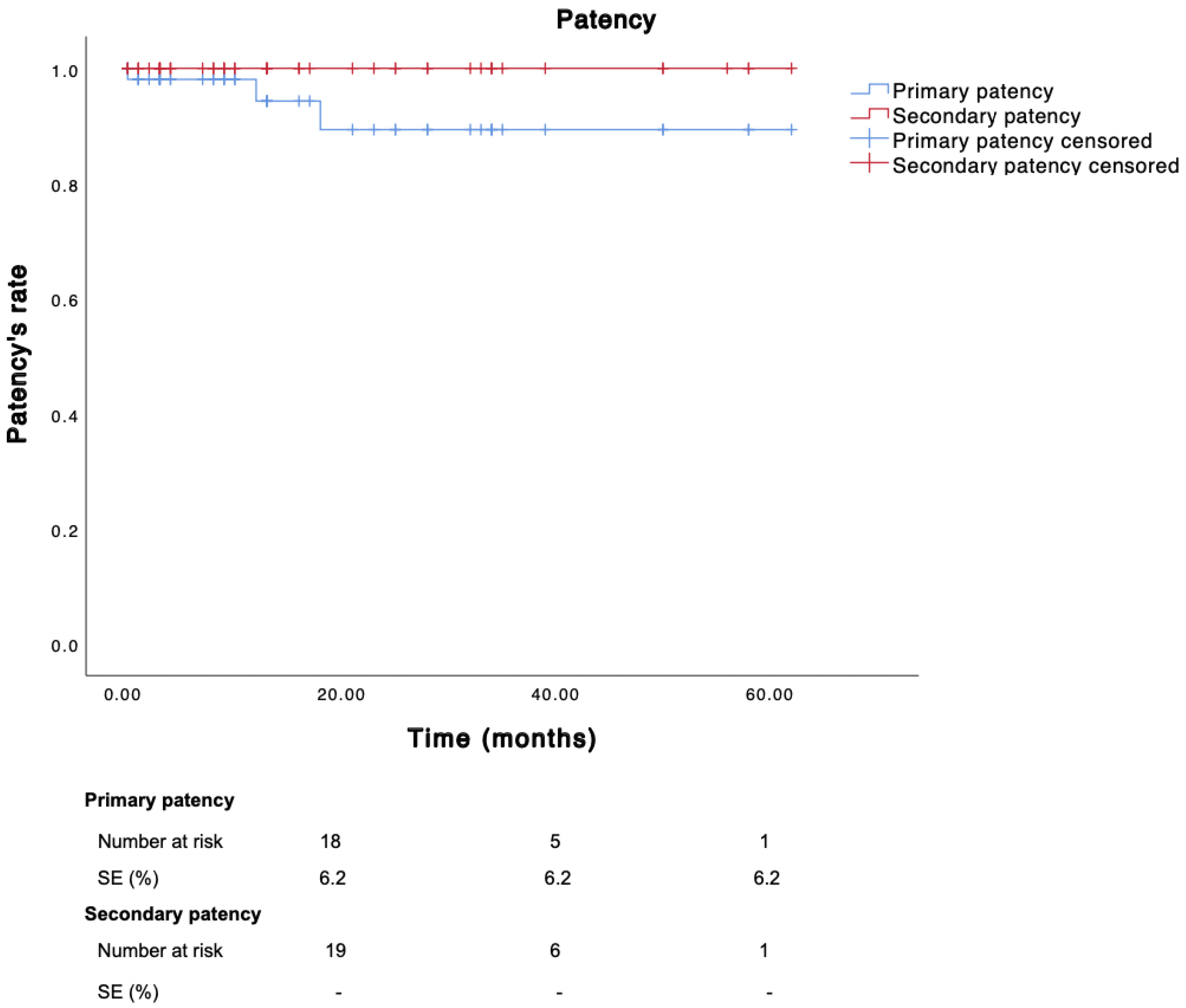 During a mean follow-up of 18 months (SD ± 17.7), the primary, primary assisted, and secondary patency rates were 94.3%, 100%, and 100%, respectively (