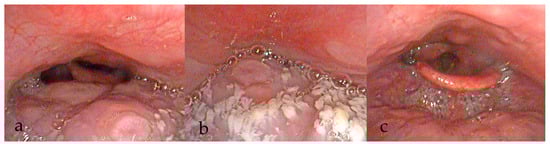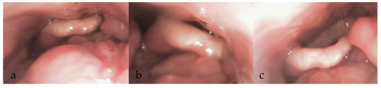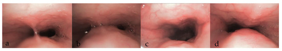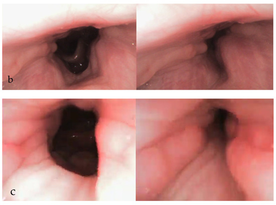 Over the years, various grading systems have been proposed to evaluate airway obstruction during DISE [68,69,70]. A 2017 systematic review identified fourteen studies that proposed different DISE classification systems [71]. This underscores the variability and subjectivity inherent in DISE reporting practices. Earlier frameworks included the employment of ordinal classifications, categorising collapses from simpler, single-level obstruction associated with less surgical necessity, to multi-level collapses that has higher surgical needs [72,73]. Classification was also proposed to provide predictive insights primarily in whether palatal surgery was recommended [74]. Sounds or noises were also considered in some of the classifications [75]. More recent approaches to DISE reporting have incorporated characterisation of the obstruction, including its site or level, collapse pattern, and severity. The sites include the soft palate, oropharynx, tonsils, tongue base, and epiglottis. Bilateral examination of the nasal cavity should be conducted to assess for enlarged turbinate, mucosal inflammation, or a deviated nasal septum, noting that these findings are consistent with those observed during awake examinations. The pattern and direction of obstructions should be documented, typically categorised as AP, lateral, or circumferential collapse (Figure 2a–c). Not all sites can exhibit every type of collapse.
