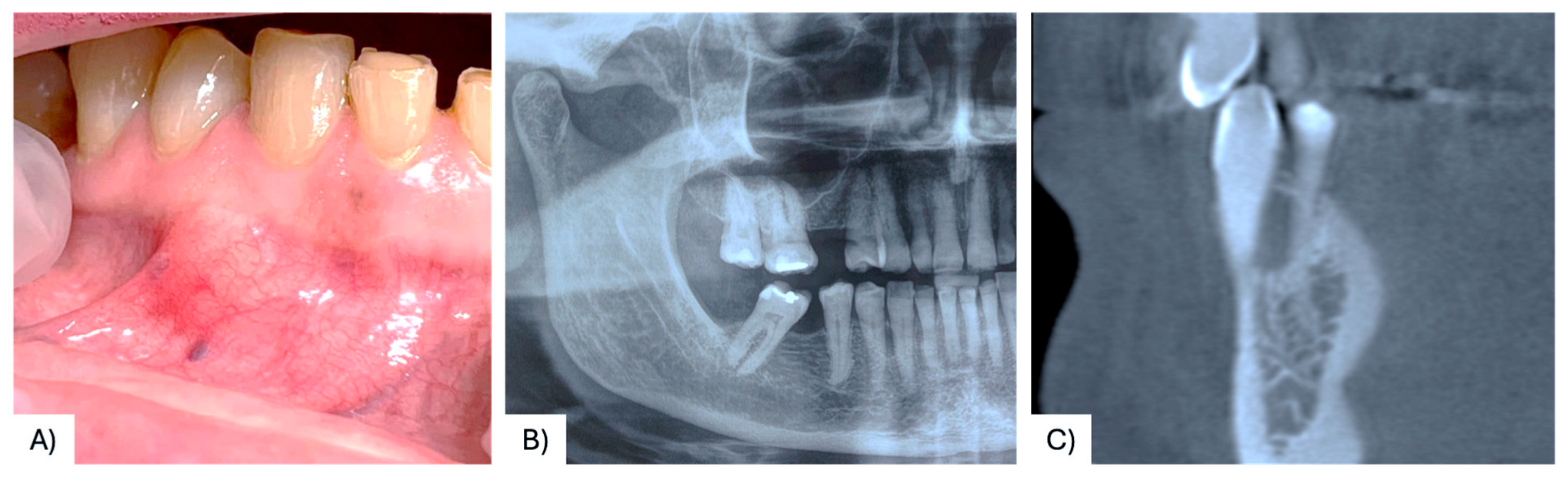 - Villota, M.H.-D.; Pampin-Martínez, M.M.; Moran-Soto, J.; Cebrián-Carretero, J.-L. Peripheral odontogenic keratocyst. A Case report. J. Clin. Exp. Dent. 2023, 15, e169–e172. [Google Scholar] [CrossRef]