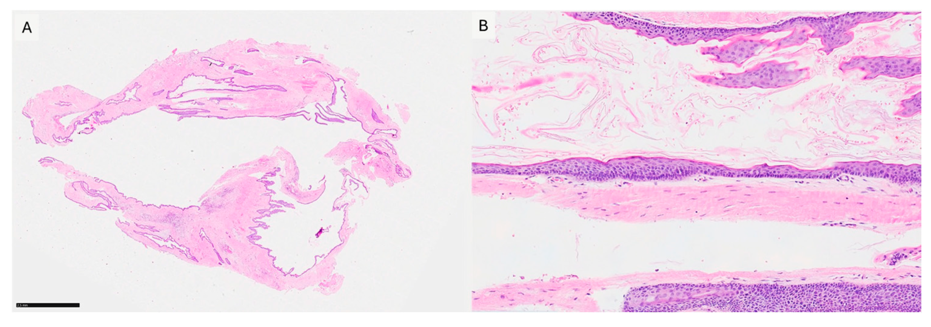 - Neville, B.W.; Damm, D.D.; Allen, C.M. Follicular Cysts of The Skin: Oral and Maxillofacial Pathology, 3rd ed.; Saunders: Philadelphia, PA, USA, 2008; pp. 32–34. [Google Scholar]