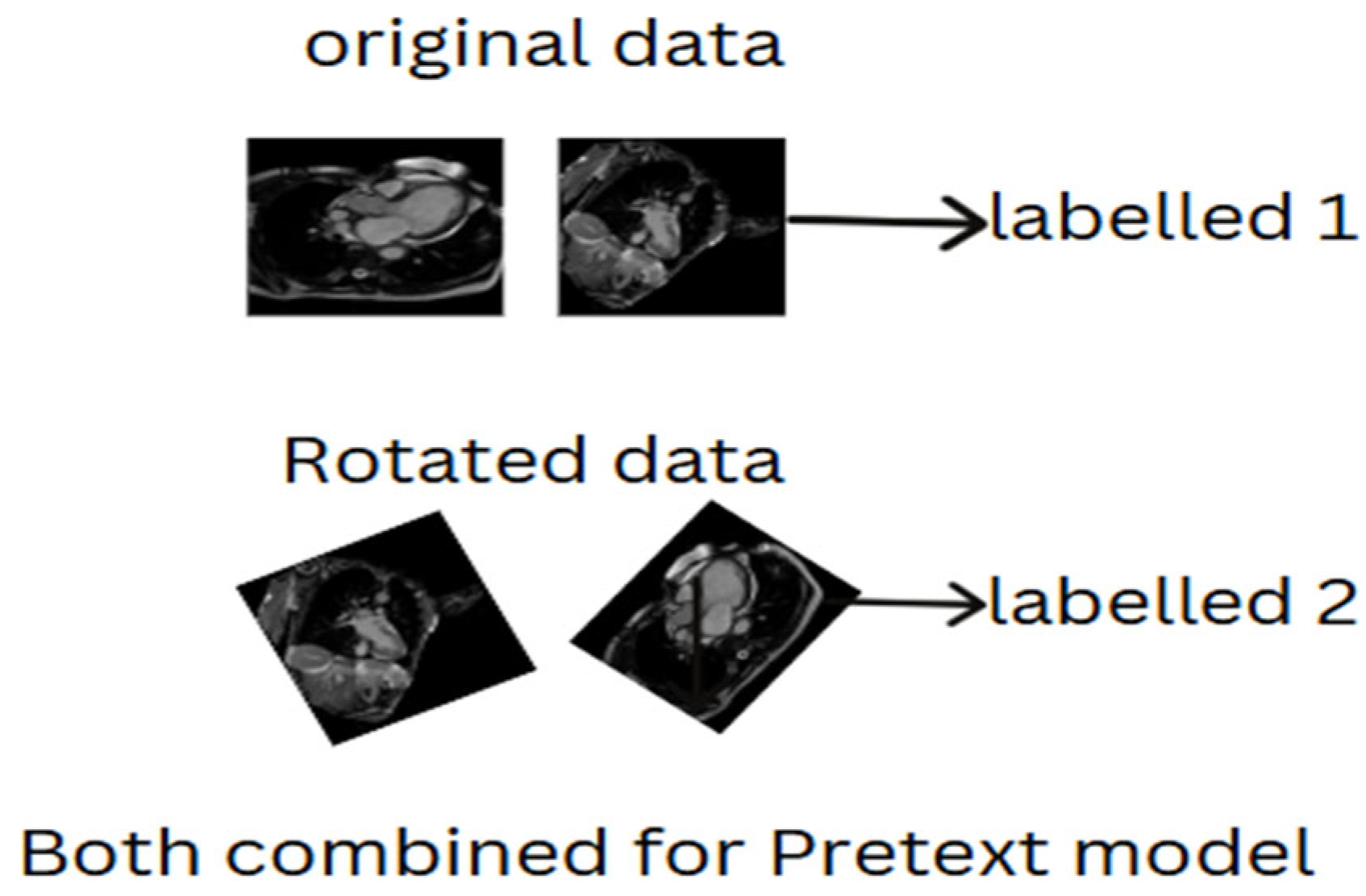 To further illustrate the concept of supervised pretext models, Figure 1 provides a visual representation of the approach. The figure shows the original data (which represents unlabeled data) alongside its corresponding rotated version, demonstrating the use of data augmentation as part of the pretext task. This augmented data is assigned a pseudo-label, and the model is tasked with differentiating between the original data and its transformation, such as the rotation applied in this case. The rotation serves as an example of the types of transformations that can be used in supervised pretext models to teach the model invariant features.