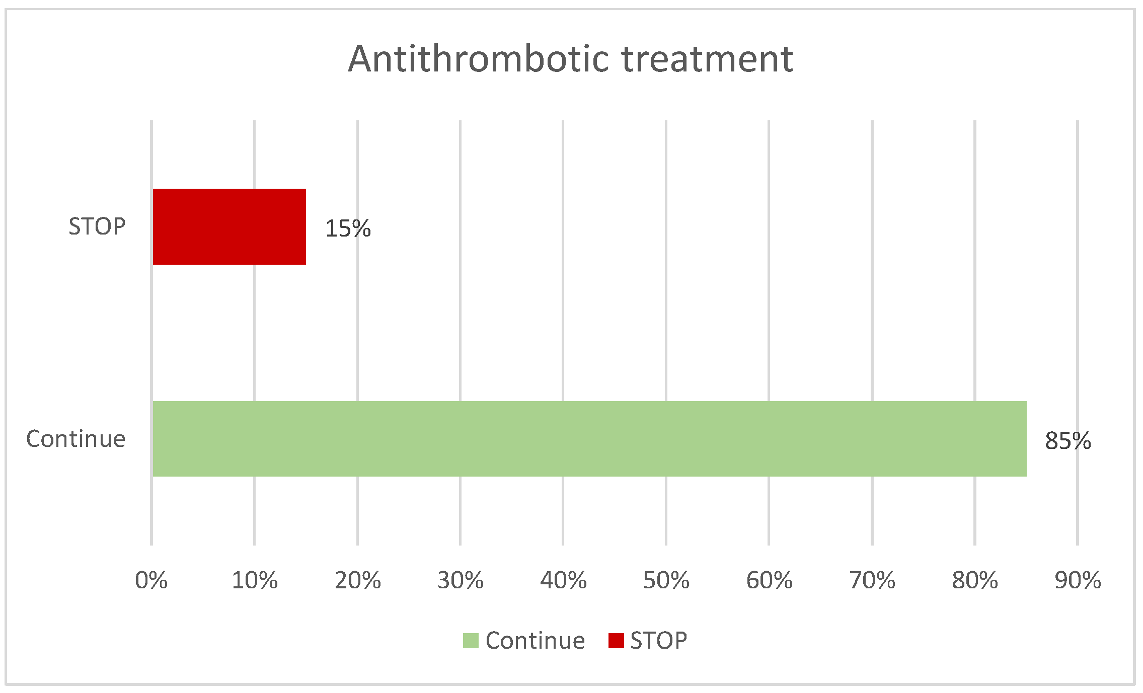 Thirteen different clinical departments referred patients for evaluation, with the highest numbers of referrals coming from Internal Medicine (30%), Otorhinolaryngology (23%), and Haematology (15%) (Figure 1). Among the patients, 50% had no prior diagnosis, compared to 35% who did, and 14% were being investigated due to other findings. Patients were questioned regarding the use of antithrombotic medication; 74% reported not taking any, while 25% did, of whom 15% required temporary discontinuation of the medication prior to the procedure (Figure 2). No complications or adverse events were recorded in any patient.