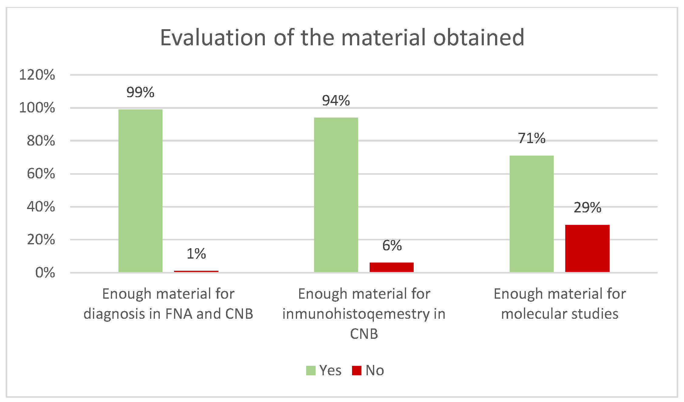 For CNB procedures, a 16G needle was used in 84% of cases, an 18G in 10%, and a 14G in 6% (Figure 6). The mean number of passes was 3. Rapid on-site evaluation (ROSE) using the touch print technique was performed in 100% of CNBs (Figure 7), and as mentioned before there was sufficient material for complementary studies (Table 2 and Figure 4).