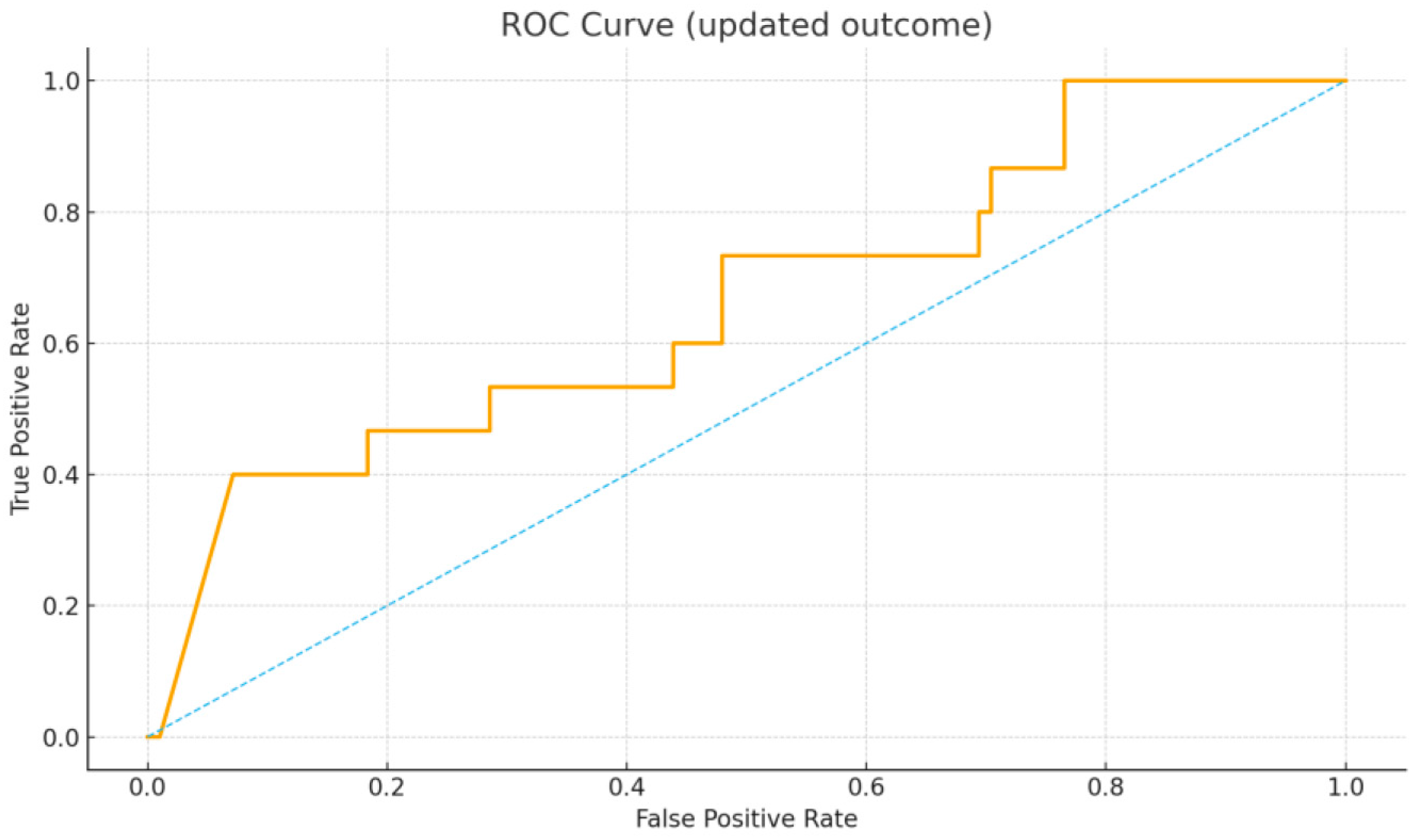 The logistic regression model included three predictors (log-ferritin, ANA, and malignancy), yielding an event-per-variable ratio of approximately 5, which is within the acceptable lower bound for exploratory analyses. Given the limited event count (n = 15), AUC estimates should be interpreted with caution but remain informative for hypothesis generation.