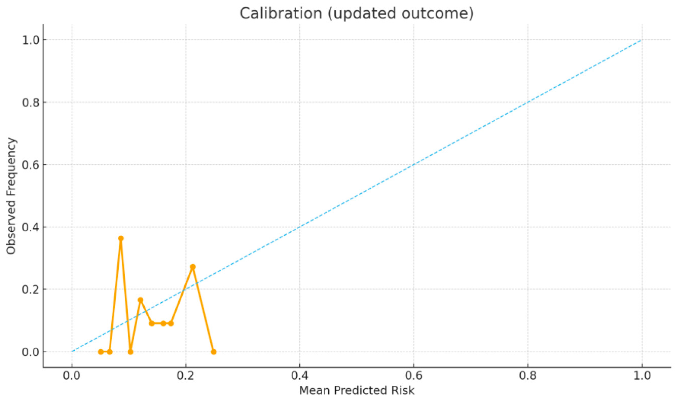 Figure 2) demonstrated poor alignment between predicted probabilities and observed frequencies, consistent with the limited predictive value of the model.