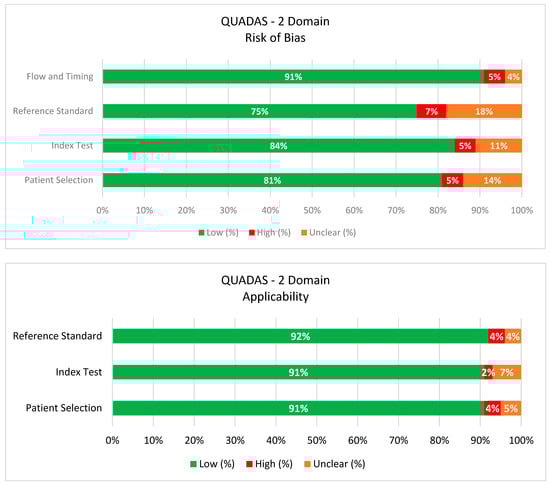 QUADAS–2 results: Proportion of studies with low, high and unclear risk for bias and applicability.