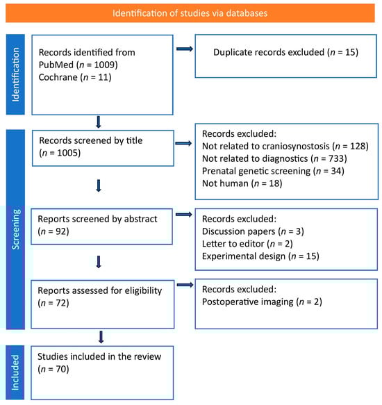 This systematic review adheres to the Preferred Reporting Items for Systematic Reviews and Meta-Analyses (PRISMA) guidelines [22]. This systematic review was registered in the Open Science Framework (OSF) on 29 September 2025. The protocol, including search strategy and inclusion criteria, is accessible at https://osf.io/tng8h, accessed on 29 September 2025. A comprehensive literature search was performed using PubMed and the Cochrane Library, covering publications from 2015 to the present, restricted to English-language and full-text articles. The search string used in both databases was: “craniosynostosis” AND “computed tomography” OR “magnetic resonance imaging” OR “ultrasound” OR “ultrasonography” OR “stereophotogrammetry” OR “radiation dose”. Studies were eligible for inclusion if they evaluated these diagnostic modalities, reported diagnostic accuracy metrics, quantified radiation exposure, or assessed neurocranial outcomes in patients with craniosynostosis. All incomplete articles and those not written in English were excluded. During data extraction, additional exclusions were made for studies that did not involve humans, children, or craniosynostosis. Studies focusing on non-clinical diagnostics, prenatal evaluations, or those with experimental designs were also excluded.