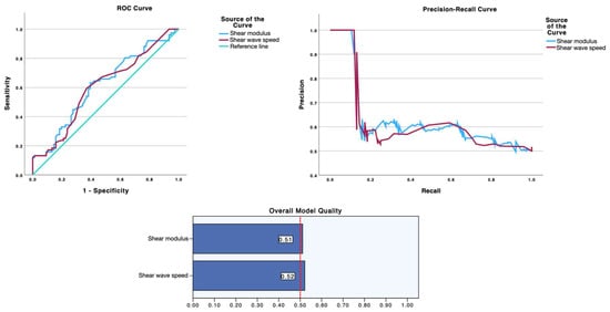 Discrimination of shear-wave elastography metrics for latent myofascial trigger points. Receiver operating characteristic (left) and precision–recall (right) curves for shear modulus (blue) and shear-wave speed (maroon), with the diagonal line indicating no discrimination and the dashed red line in the PR panel marking baseline precision (~0.50). Areas under the ROC curve were 0.611 for shear modulus and 0.601 for shear-wave speed (both p < 0.05). The “Overall Model Quality” bars (bottom) show values near 0.51–0.52, indicating only modest improvement over chance. Optimal cut-offs and operating characteristics are reported in Table 2.