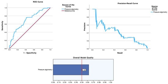 Diagnostic performance of pressure algometry for identifying latent myofascial trigger points. Receiver operating characteristic (left) and precision–recall (right) curves for pressure algometry (blue). The ROC AUC was 0.704 (95% CI 0.622–0.786; p < 0.001), exceeding the performance of the SWE metrics shown in Figure 1. The “Overall Model Quality” (bottom) is ~0.62, consistent with stronger precision across a broad recall range relative to SWE. The Youden-optimal cut-off was 47.5 N; corresponding sensitivity, specificity, and likelihood ratios are detailed in Table 2.