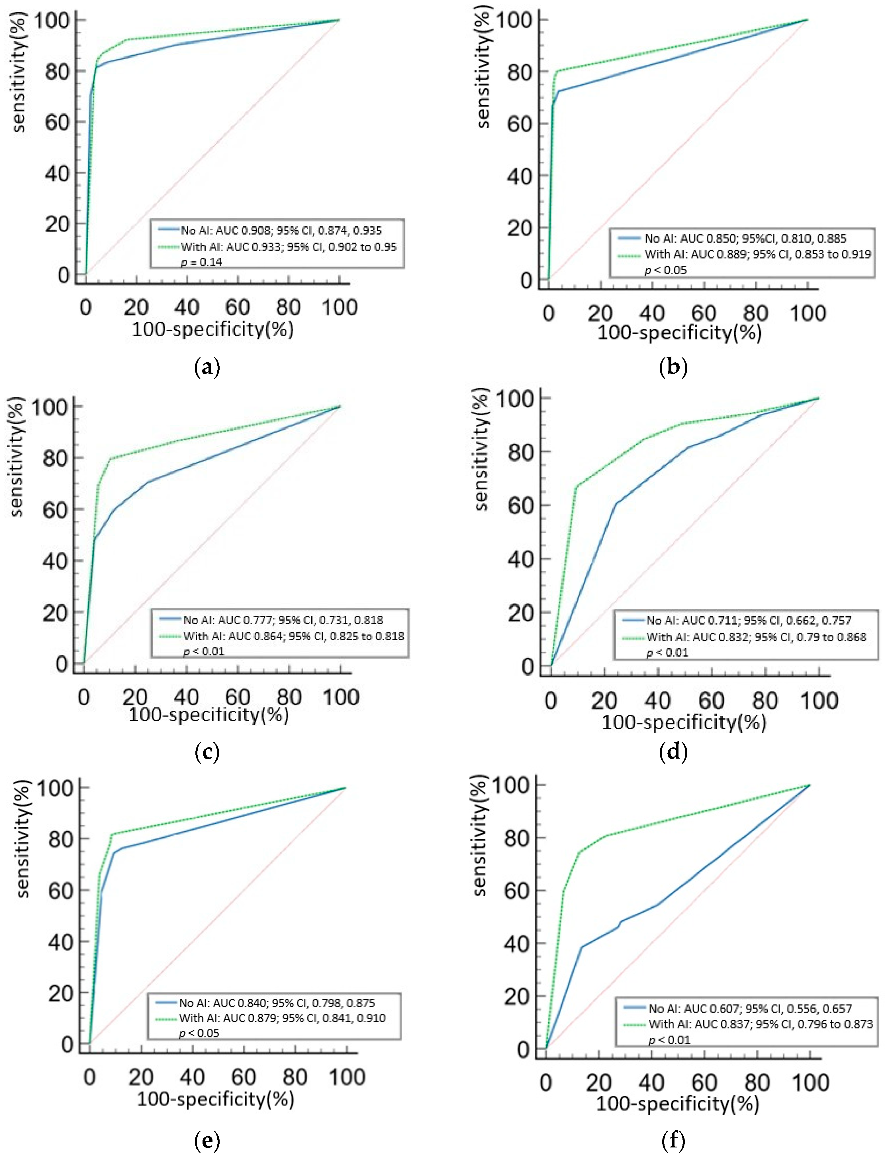 3.2. Performance of AI Alone and Compared with Unassisted Readers
