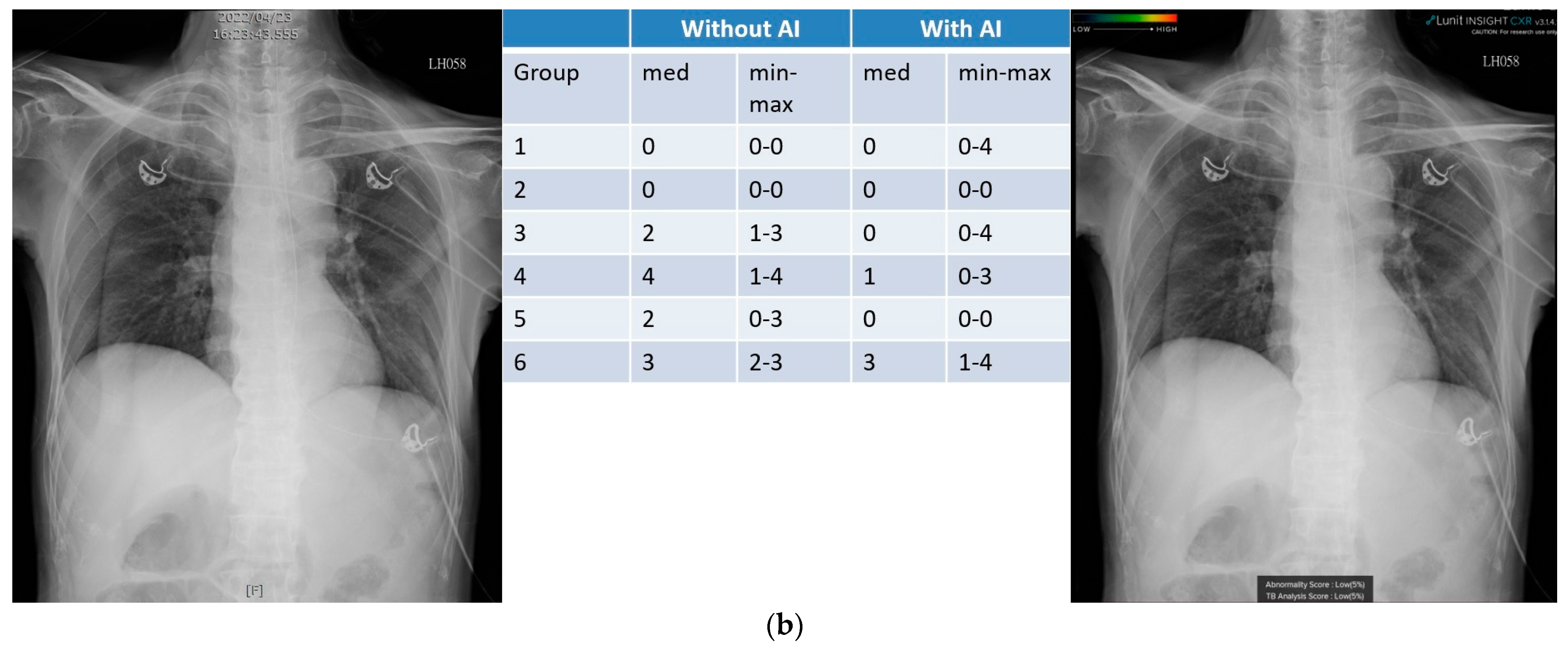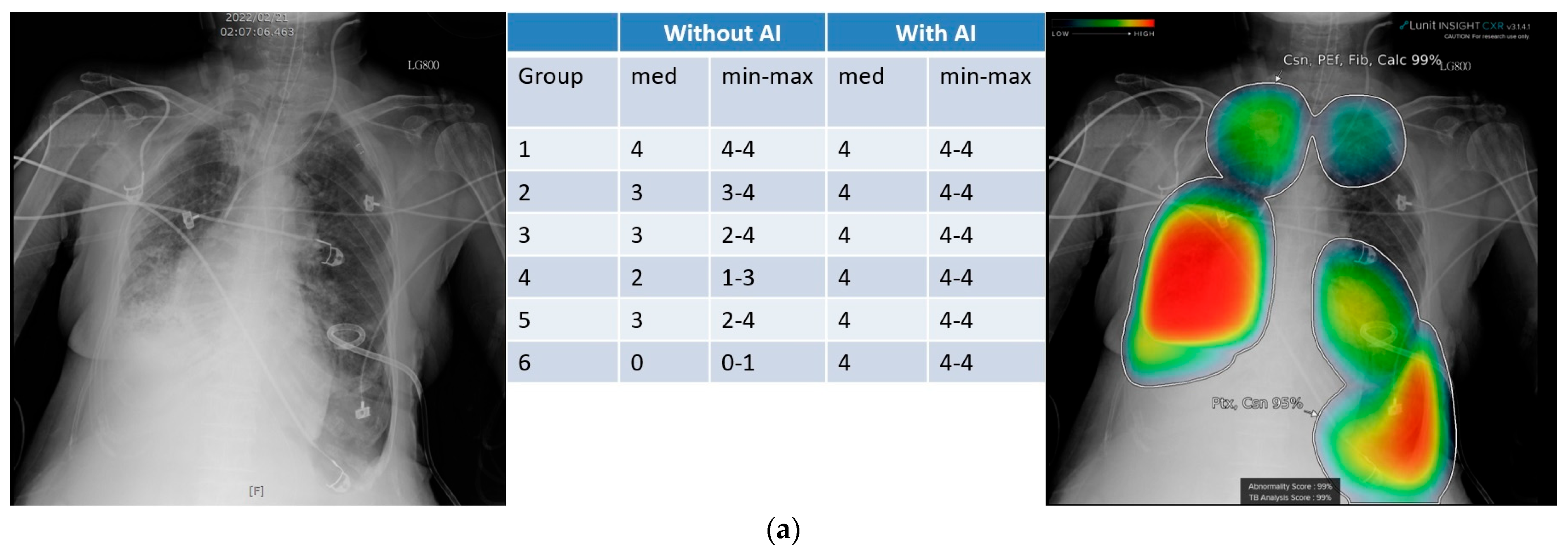 - Ahn, J.S.; Ebrahimian, S.; McDermott, S.; Lee, S.; Naccarato, L.; Di Capua, J.F.; Wu, M.Y.; Zhang, E.W.; Muse, V.; Miller, B.; et al. Association of Artificial Intelligence-Aided Chest Radiograph Interpretation with Reader Performance and Efficiency. JAMA Netw. Open 2022, 5, e2229289. [Google Scholar] [CrossRef]