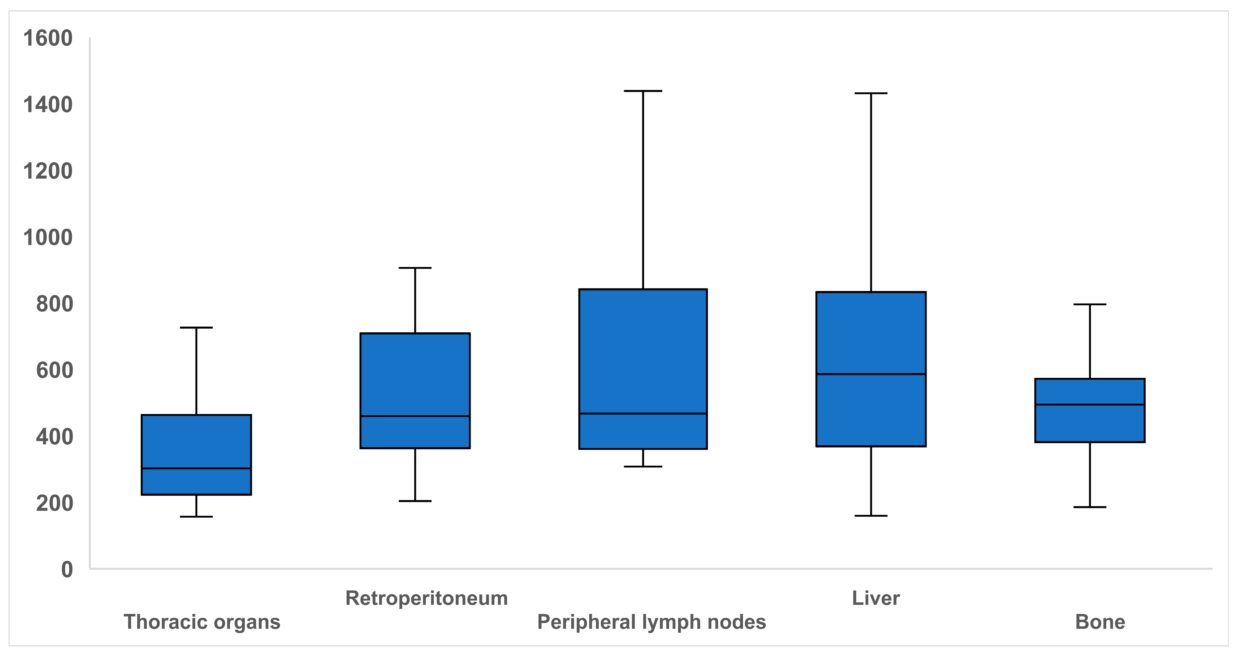 Organ | liver | thoracic organs (lung, lymph nodes mediastinal) | Retroperitoneum (kidney, retroperitoneal space, paraaortic lymph nodes) | Peripheral lymph nodes (axillary, iliac, inguinal, pelvic, cervical) | bone | |