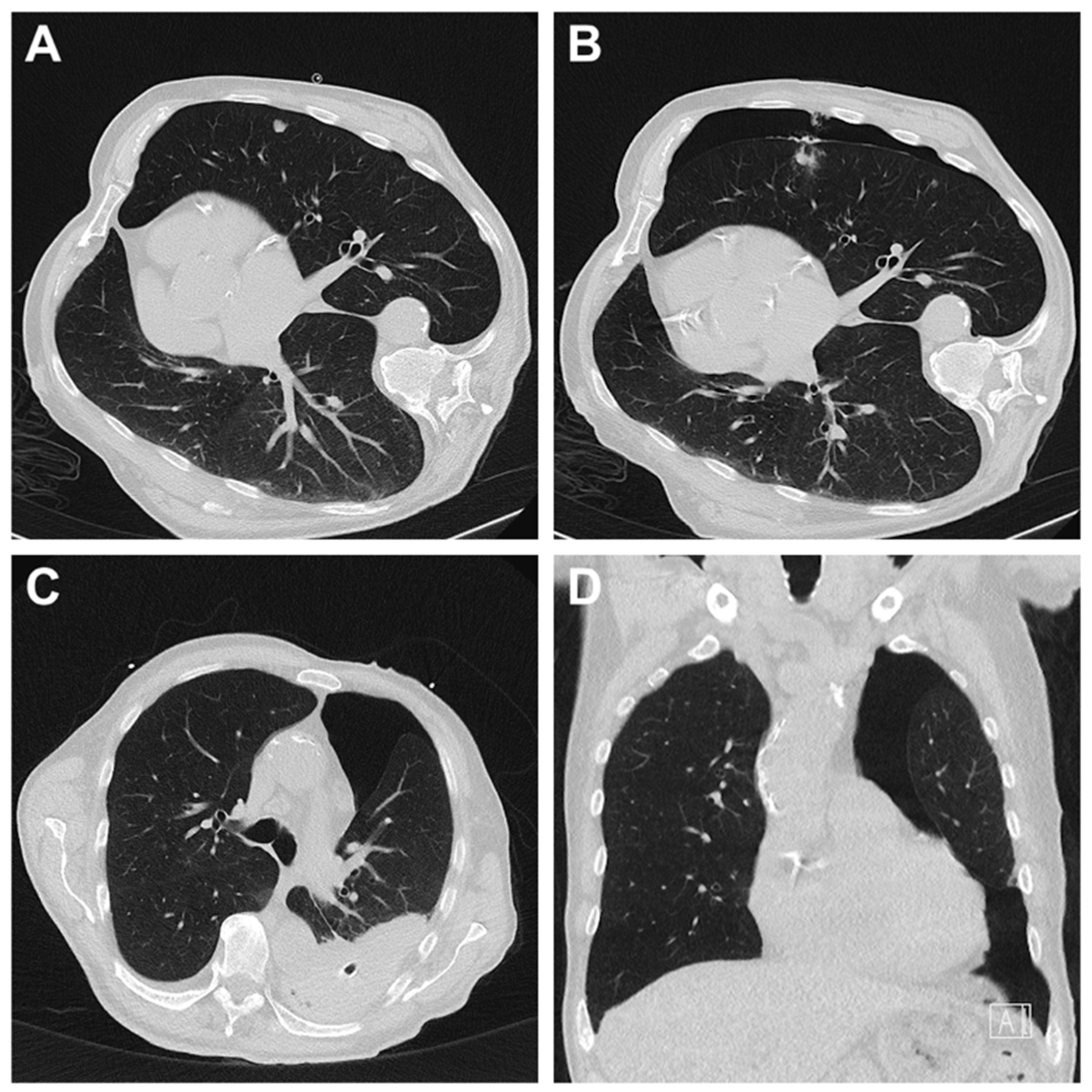 - Weinand, J.T.; du Pisanie, L.; Ngeve, S.; Commander, C.; Yu, H. Pneumothorax after Computed Tomography-Guided Lung Biopsy: Utility of Immediate Post-Procedure Computed Tomography and One-Hour Delayed Chest Radiography. PLoS ONE 2023, 18, e0284145. [Google Scholar] [CrossRef]
