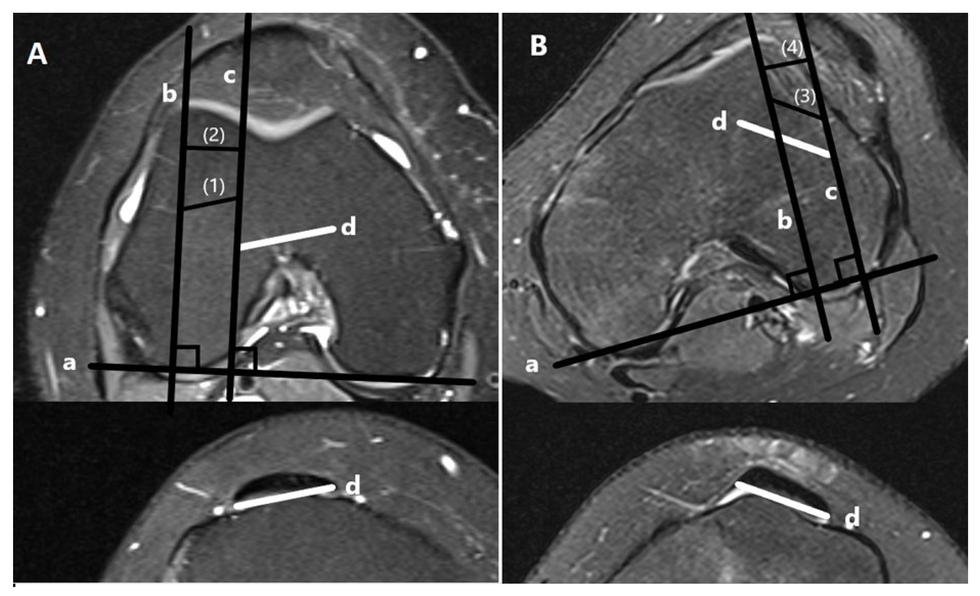- Steensen, R.N.; Bentley, J.C.; Trinh, T.Q.; Backes, J.R.; Wiltfong, R.E. The prevalence and combined prevalences of anatomic factors associated with recurrent patellar dislocation: A magnetic resonance imaging study. Am. J. Sports Med. 2015, 43, 921–927. [Google Scholar] [CrossRef] [PubMed]