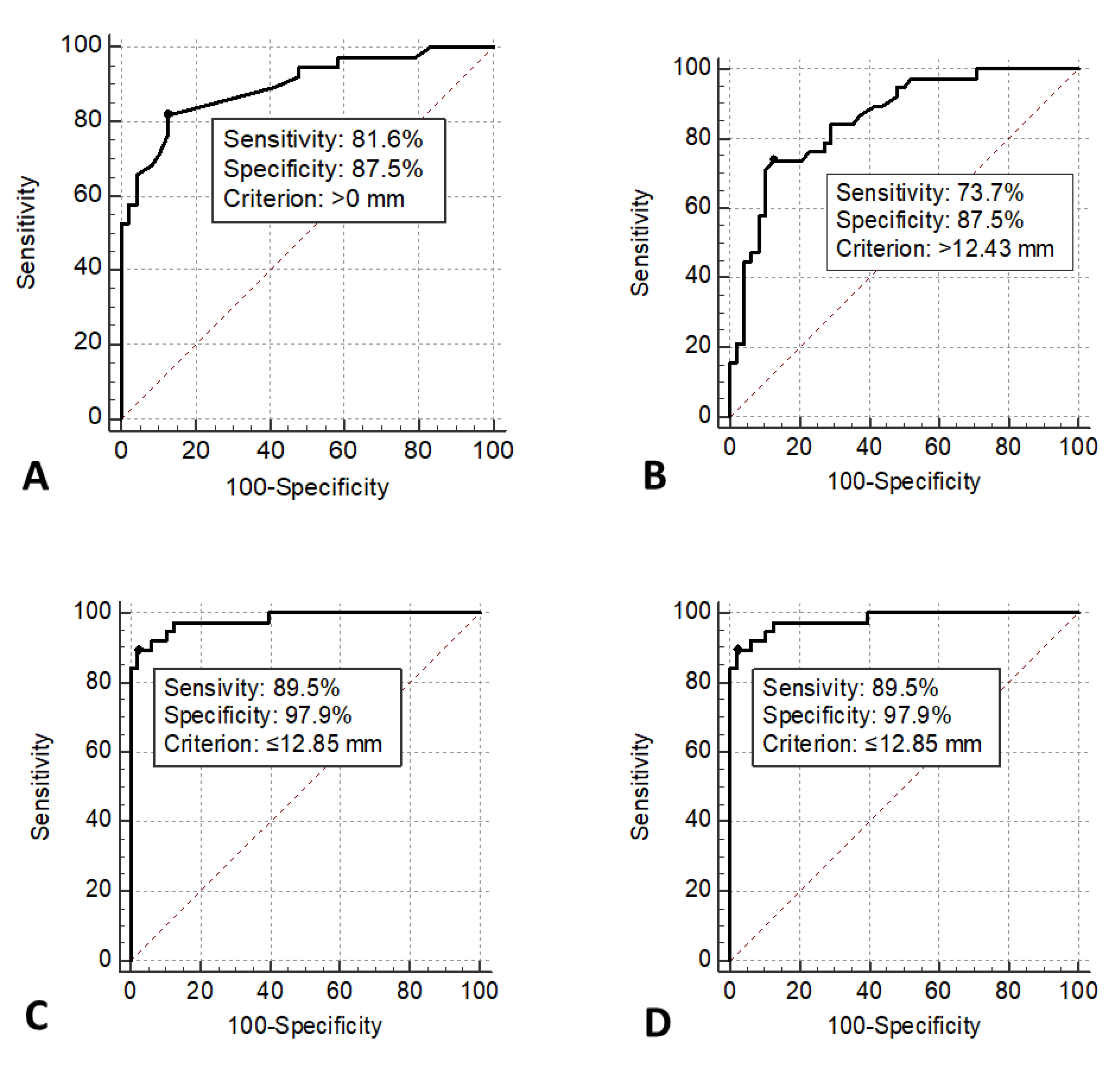 Measurement | Cut-Off | Sensitivity (%) | Specificity (%) |
