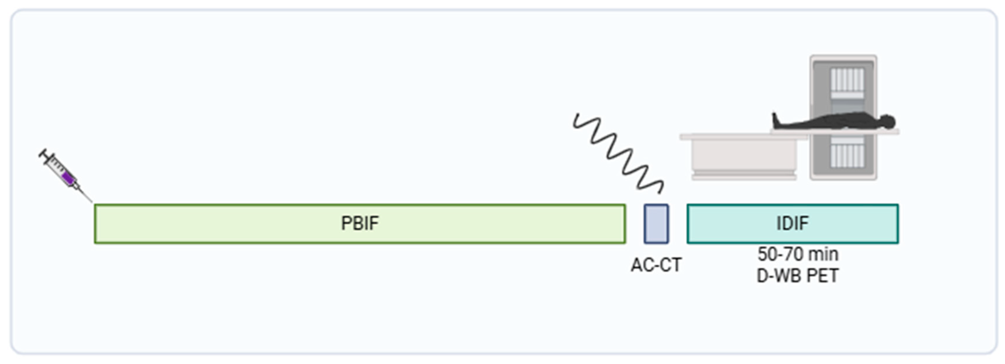 - Dias, A.H.; Smith, A.M.; Shah, V.; Pigg, D.; Gormsen, L.C.; Munk, O.L. Clinical validation of a population-based input function for 20-min dynamic whole-body 18F-FDG multiparametric PET imaging. EJNMMI Phys. 2022, 9, 60. [Google Scholar] [CrossRef]