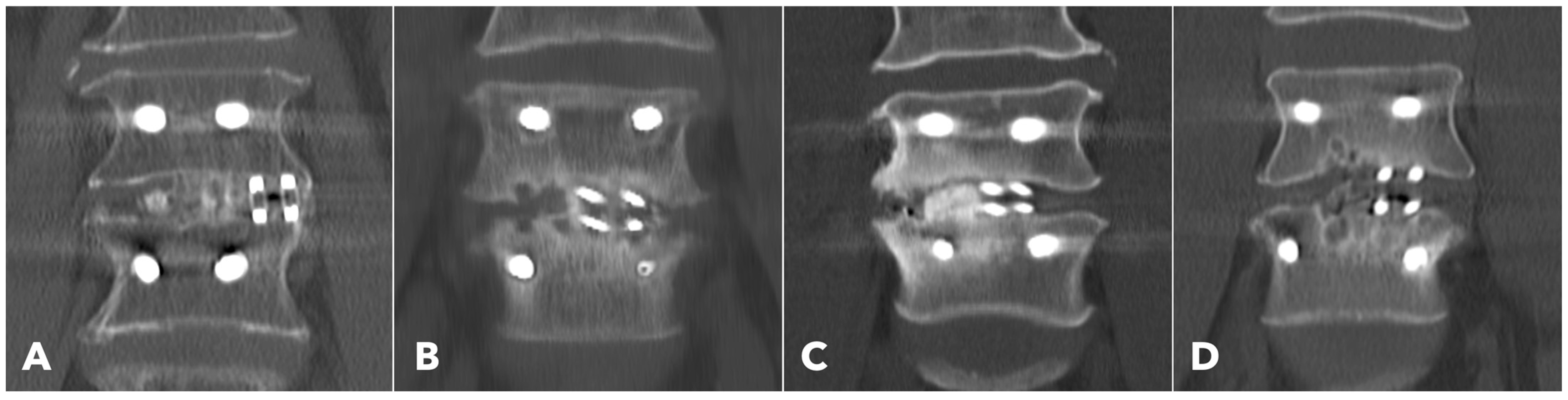 - Duits, A.A.A.; van Urk, P.R.; Lehr, A.M.; Nutzinger, D.; Reijnders, M.R.L.; Weinans, H.; Foppen, W.; Oner, F.C.; van Gaalen, S.M.; Kruyt, M.C. Radiologic Assessment of Interbody Fusion: A Systematic Review on the Use, Reliability, and Accuracy of Current Fusion Criteria. JBJS Rev. 2024, 12, e23.00065. [Google Scholar] [CrossRef] [PubMed]