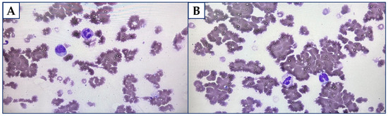 Two weeks following the CAD diagnosis, this patient was referred to the Haematology Ward for further diagnostics and treatment. He reported then a pharyngalgia. There was confirmed right axillary and inguinal lymphadenopathy (up to 15 mm) along with splenomegaly and hepatomegaly during physical examination. The blood test showed diminished levels of white blood cells (WBC) count (2.83∙103/mm3), lymphocytes (0.41∙103/mm3), and Hb (8.10 g/dL). The issue of agglutination led to false RBC count and other rates using that parameter. Furthermore, the level of IgM was stated as 31.55 g/L, and for β2-microglobulin it was 4.17 mg/L. The results of free light chain (FLC) assays were 56.85 mg/L for κ and 6.98 mg/L for λ. The ratio κ/λ was assessed as 8.145. Figure 1A,B display the peripheral blood smear with the features of RBC agglutination.