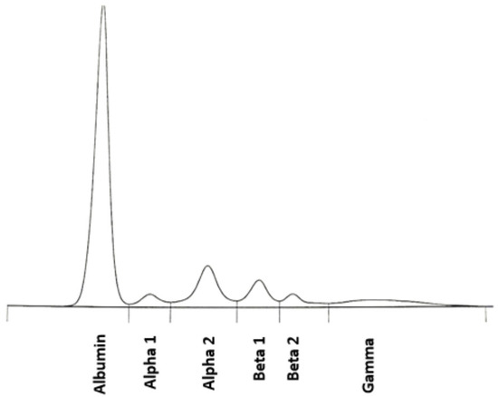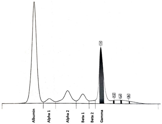 Moreover, serum protein electrophoresis (SPEP) was performed (the results are displayed in Figure 2 and Table 1 in the main text and Table A1 in Appendix A.1). Peak 1—the level of M monoclonal protein (isotype IgM κ) was assessed as 1.31 g/dL (18.4%).