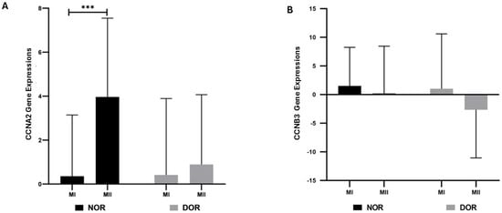 The gene expressions of CCNA2 and CCNB3 were determined based on normoresponder (NOR) and diminished ovarian reserve (DOR) cases’ MI and MII COC cells in oocyte phases [ns indicates a p > 0.05, which represents non-significance; and *** indicates p < 0.001; error bars represent the mean ± standard deviation (SD)]. (A) The CCNA2 gene expressions in the NOR and DOR cases’ MI and MII phases (*** p < 0.001; p > 0.05). (B) CCNB3 gene expressions in the NOR and DOR cases’ MI and MII phases (p > 0.05).