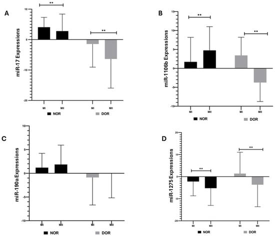 The expressions of miR-17, miR-106b, miR-190a, and miR-1275 were determined based on normoresponder (NOR) and diminished ovarian reserve (DOR) cases’ MI and MII phases in COC cells [ns indicates a p > 0.05, which represents non-significance and ** indicates a p < 0.05; error bars represent the mean ± standard deviation (SD)]. (A) miR-17 expressions in the NOR and DOR cases’ MI and MII phases (** p < 0.05); (B) miR-106b expressions in the NOR and DOR cases’ MI and MII phases (** p < 0.05); (C) miR-190a expressions in the NOR and DOR cases’ MI and MII phases (p > 0.05); (D) miR-1275 expressions in the NOR and DOR cases’ MI and MII phases (** p < 0.05).