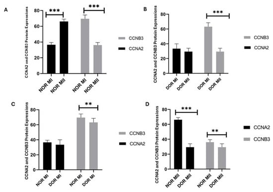 CCNA2 protein expression showed a statistically significant increase in the MII phase (66.142 ± 2.968) compared to the MI phase (36.571 ± 2.878) in the NOR group (p < 0.001; Figure 3). The CCNB3 protein expression in the NOR group showed a statistically significant increase in the MI phase (69.571 ± 4.825) compared to the MII phase (36.142 ± 3.287) (p < 0.001; Figure 3). The CCNA2 protein expression was not statistically significant in the MII phase (29.428 ± 4.613) of the DOR group compared to the MI phase (33.428 ± 6.553) (p > 0.05; Figure 3), whereas CCNB3 protein expression showed a statistically highly significant increase in the MI phase (63.142 ± 5.336) of the DOR group compared to the MII phase (29.428 ± 4.613) (p < 0.001; Figure 3). The CCNA2 protein expression was not statistically significant in the NOR group MI phase (36.571 ± 2.878) compared to the DOR group MI phase (33.428 ± 6.553) (p > 0.05; Figure 3). The CCNB3 protein expression in the NOR group MI phase (69.571 ± 4.825) showed statistically lower significance compared to the DOR group MI phase (63.142 ± 5.336) (p < 0.05; Figure 3). The CCNA2 protein expression showed a statistically highly significant increase in NOR group MII phase (66.142 ± 2.968) compared to the DOR MII phase (29.428 ± 4.613) (p < 0.001; Figure 3). The CCNB3 protein expression showed statistically lower significance in the NOR group MII phase (36.142 ± 3.287) compared to the DOR MII phase (29.428 ± 4.613) (p < 0.05; Figure 3). The values of protein expression are indicated as the percentage of positive cells.