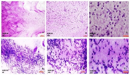 Morphological evaluation of NOR MI and MII phases of oocytes’ COC cells. (A) NOR MI 4×; (B) NOR MI 10×; and (C) NOR MI 20× magnification. (A1) NOR MII 4×; (B1) NOR MII 10×; and (C1) NOR MII 20× magnification of the light microscope.