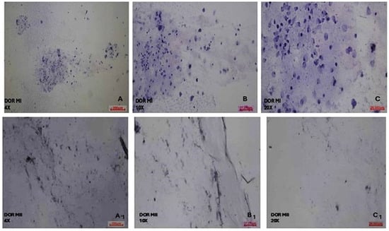 Morphological evaluation of DOR MI and MII phases of oocytes’ COC cells. (A) DOR MI 4×; (B) DOR MI 10×; and (C) DOR MI 20× magnification. (A1) DOR MII 4×; (B1) DOR MII 10×; (C1) DOR MII 20× magnification of light microscope.