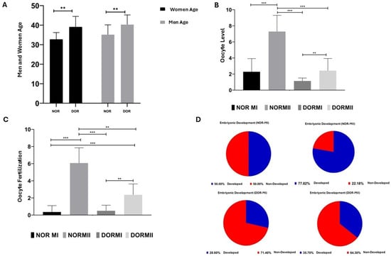 Metadata analysis of the NOR and DOR cases, performed retrospectively [ns = p > 0.05, which indicates non-significance; ** represents a p < 0.05; and *** represents a p < 0.001; error bars represent the mean ± standard deviation (SD)]. (A) The female and male NOR and DOR case groups (** p < 0.05); (B) oocyte-level analysis in the NOR MI, MII and DOR MI, and MII cases (*** p < 0.001; p > 0.05); (C) the oocyte fertilization in the NOR MI, MII and DOR MI, and MII cases. (** p < 0.05; *** p < 0.001); (D) embryo development potential in the NOR MI, MII and DOR MI, and MII cases (50% in NOR MI, 77.8% in NOR MII, 28.6% in DOR MI, and 35.7% in DOR MII).
