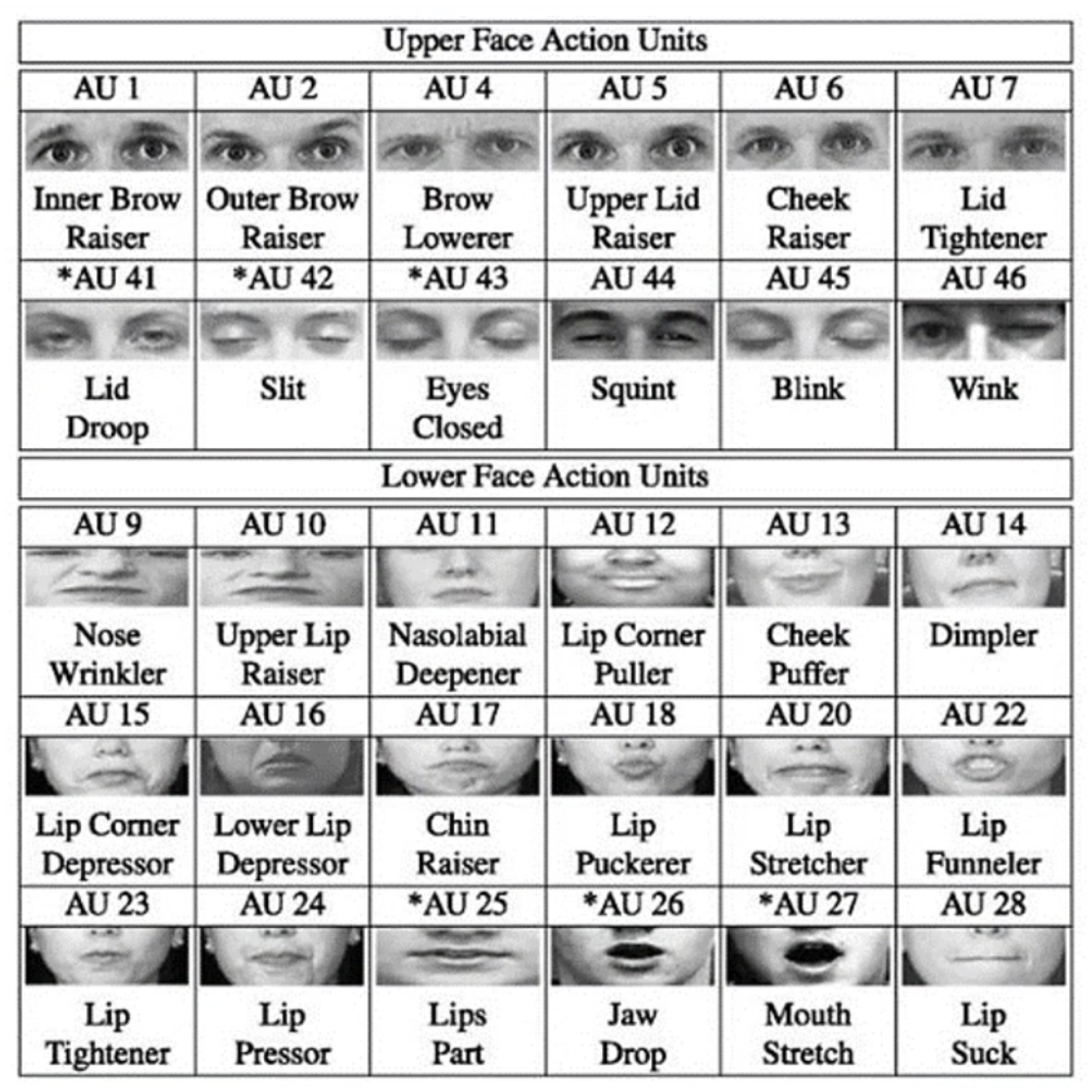 34]. Pain intensity is quantified using the PSPI index, a standardized metric derived from frame-by-frame FACS analysis, which measures specific AUs associated with pain expressions. The unique codes of AUs are shown in