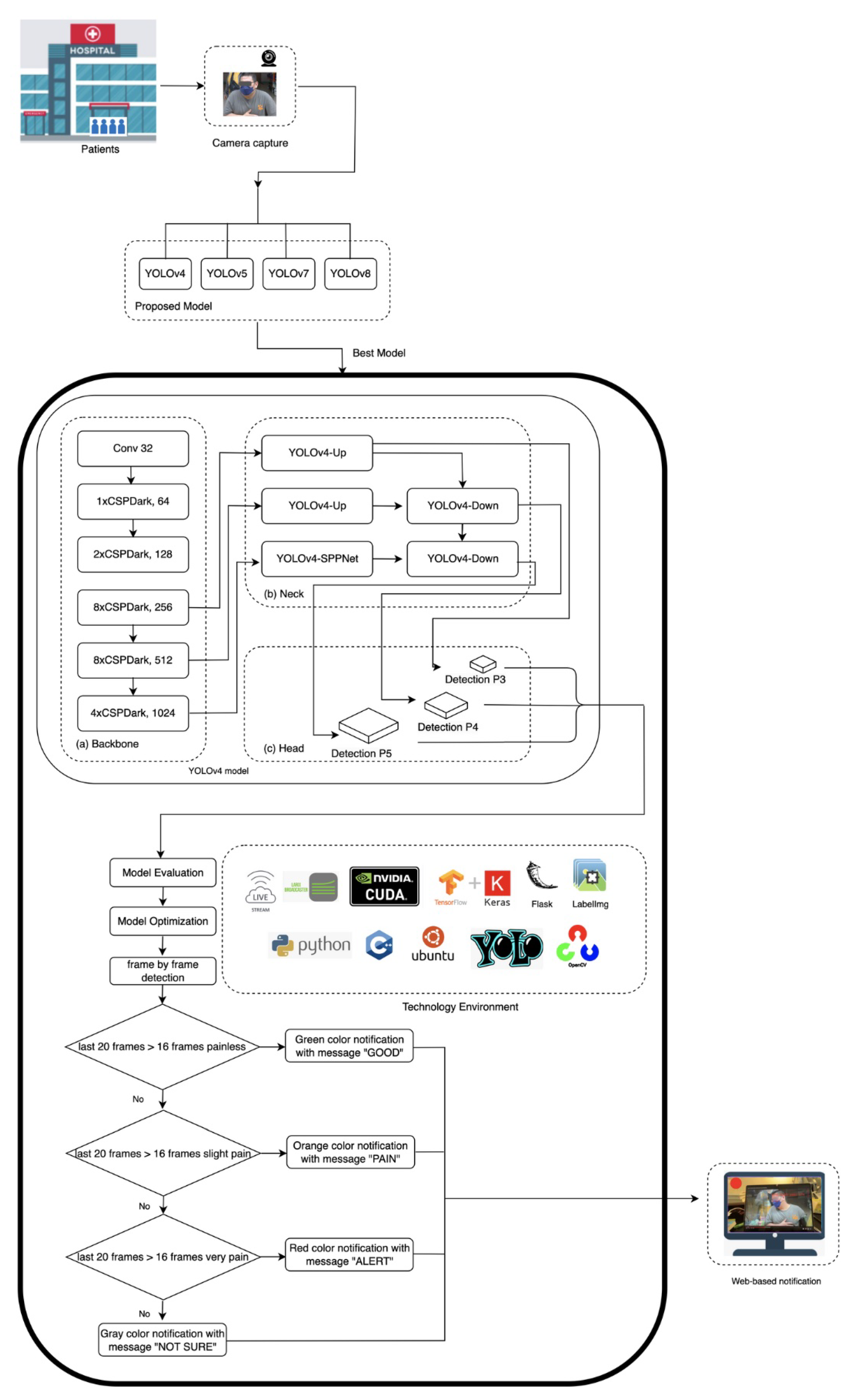 The main environment uses the operating systems Linux Ubuntu 22.04, language programming Python 3, compute unified device architecture (CUDA), CUDA deep neural network (cuDNN) library, zlib compression library, CMake compatibility platform, OpenCV library, Tensorflow framework, Keras framework, and Darknet framework. The Keras framework preprocessed the data, and then the Tensorflow framework trained the deep learning model. YOLO provides several scaled architecture versions: t (tiny), n (nano), s (small), m (medium), l (large), and x (extra large). The model development pipeline employed an architecture selection between YOLOv4 and YOLOv4t as its lightweight variant for real-time detection of chest pain intensity. While YOLOv4t offered faster inference speeds for real-time ER triage, its accuracy was lower than that of YOLOv4 on benchmark datasets, prompting a comparative evaluation of both architectures. We initialized training using the YOLOv4.conv.137 pre-trained weights for YOLOv4 whilst the YOLOv4-tiny.conv.29 pre-trained weights were used for the YOLOv4t. In the actual tests and evaluations, we found that YOLOv4t was less recognizable. Given the absence of fast-moving subjects in clinical settings and the critical requirement for precise pain intensity assessment, the YOLOv4 model was selected as the base architecture due to its demonstrated superiority in analyzing pain-related facial expression.
