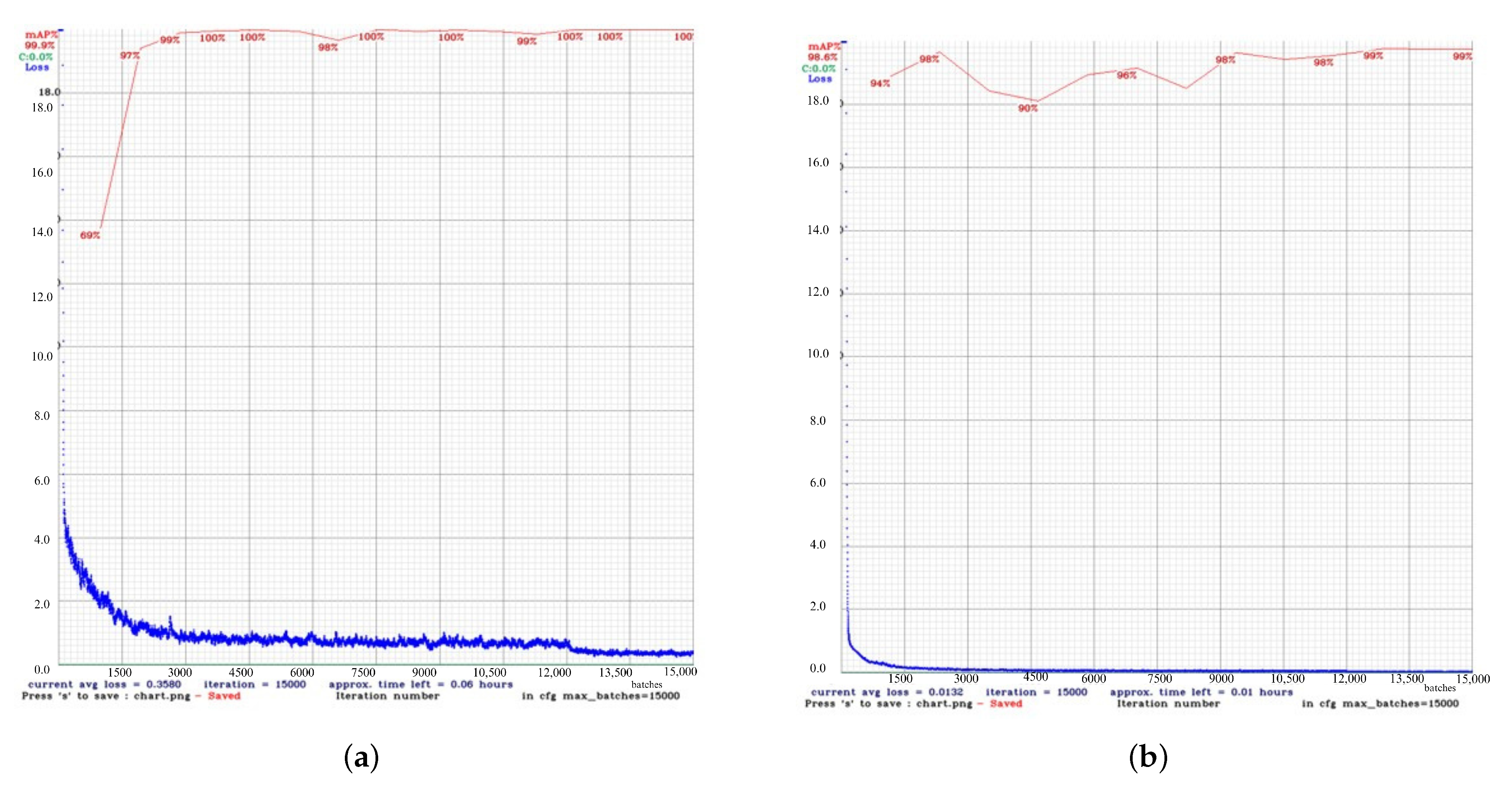 Figure 3a). For comparison, the dynamics of YOLOv4t training were less predictable, but at iteration 2,500, YOLOv4t had a competitive mAP of 98% (