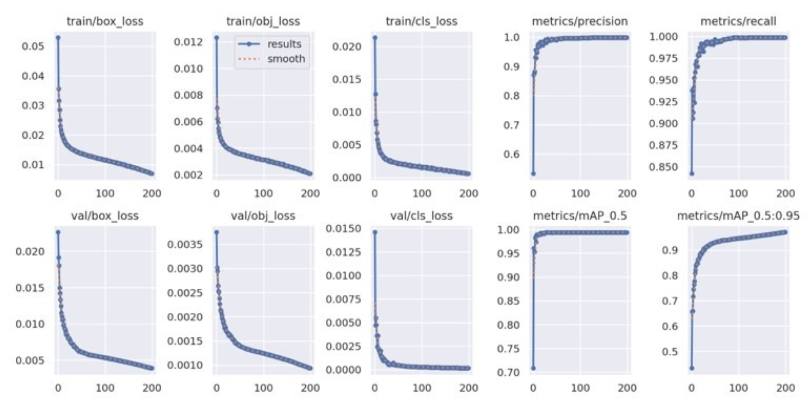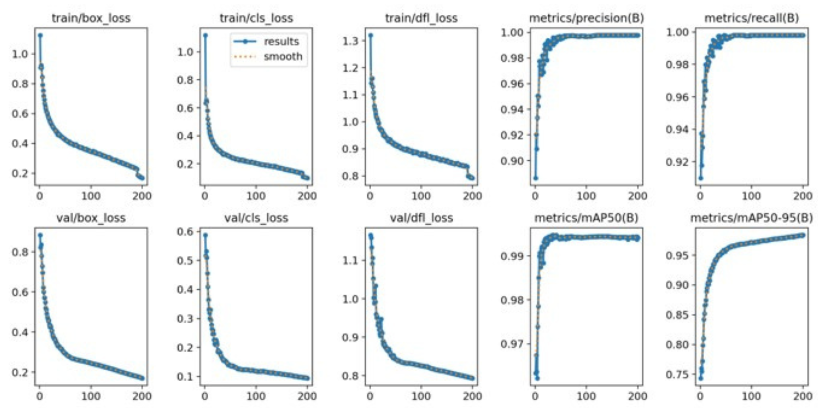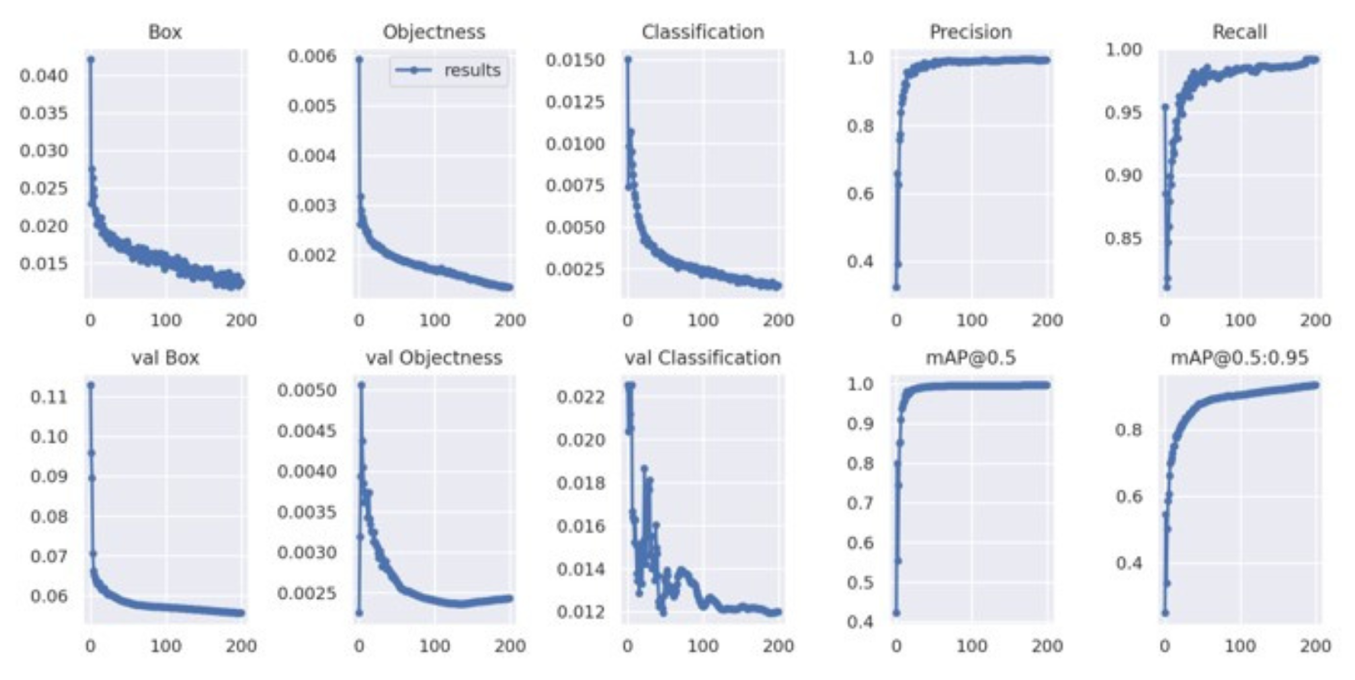 Figure 5 presents the training curves of the YOLOv5x model during its learning period over 200 epochs. During training, the model was able to minimize errors. In the bounding box loss plot, the curve decreased over time, demonstrating that the model is improving at localizing objects. The object loss plot shows the gradually decreasing curve, meaning that the model is improving in distinguishing objects from the background. The trends of the validation loss curves were similar to the trends of the training box loss curves.