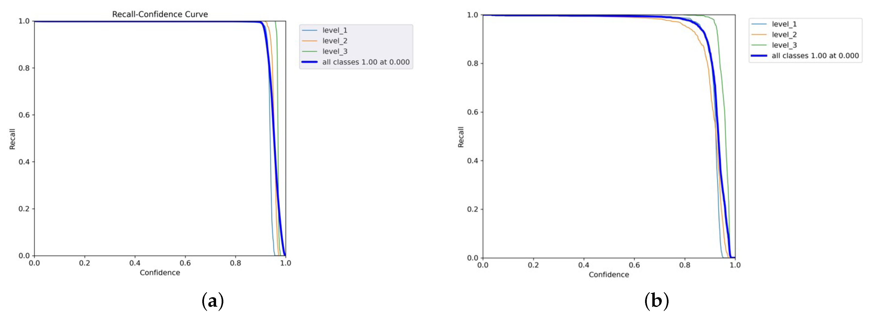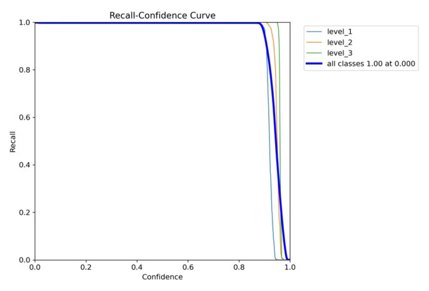 Figure 11 are the recall–confidence curves of YOLOv5x, YOLOv7x, and YOLOv8x that depict how recall is affected by the confidence threshold. It ensures that no pain cases are missed, especially in medical settings where missing pain is unacceptable.