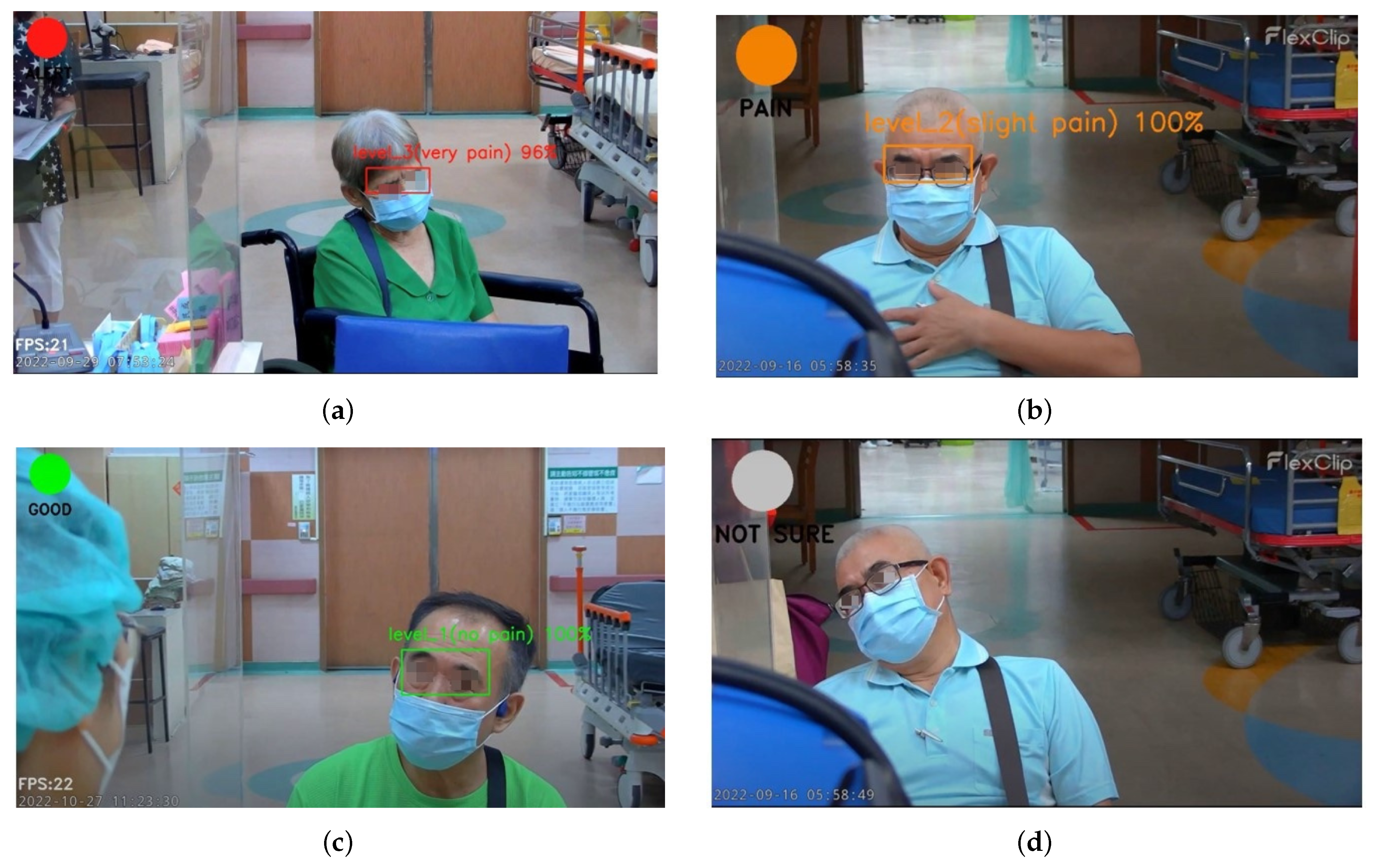 Figure 13a–d show the effectiveness of the custom YOLOv4 model for classification of pain intensity based on facial expressions. The model performs well despite masks. The system accommodated the uncertain intensity of pain that is shown in