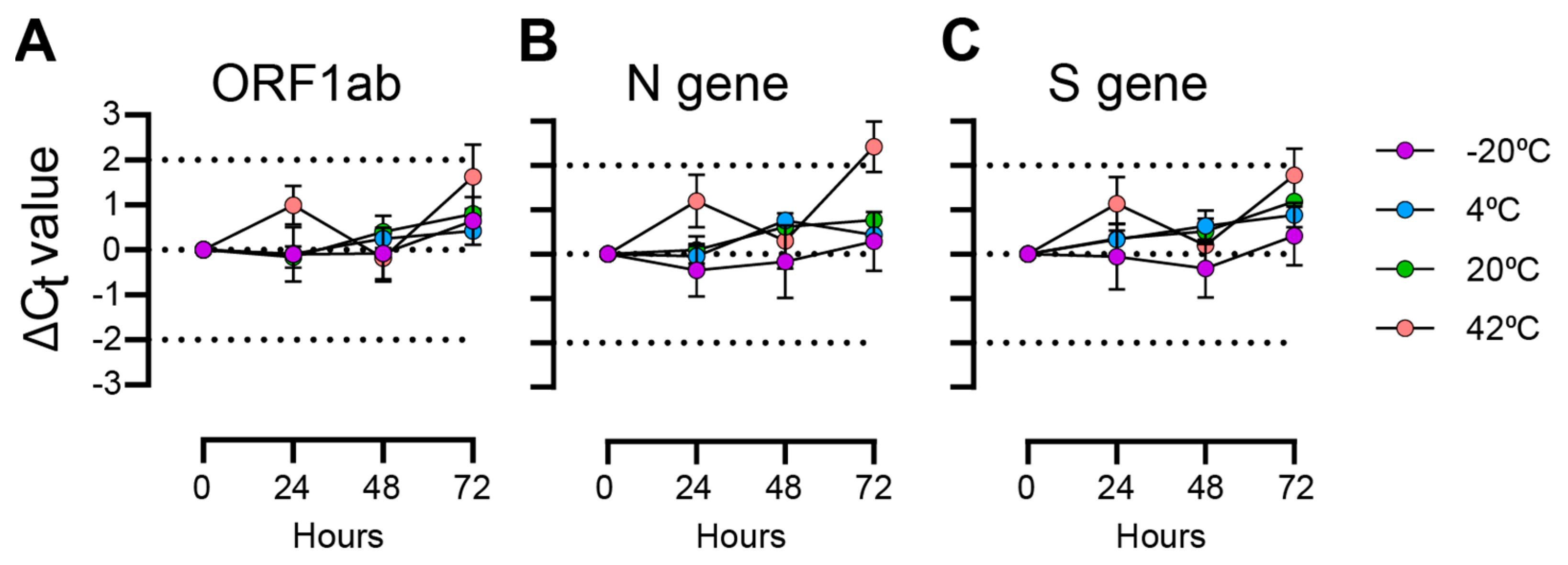 With self-collection, there are often delays between saliva collection and sample processing, so we tested SARS-CoV-2 virus particle detection at different times up to 72 h at four storage temperatures (Figure 1). At the ORF1ab locus, Ct values deviated by less than 1 Ct over 72 h for the −20 °C, 4 °C, and 20 °C samples. There were greater deviations observed in samples incubated at 42 °C, but differences to the initial Ct values stayed within 2 Ct values. Slightly greater Ct deviations were observed at the N gene and S gene loci. Overall, the differences we observed at the −20 °C and 4 °C temperatures deviated less than those incubated at 20 °C, and the samples incubated at 42 °C showed the greatest deviations.